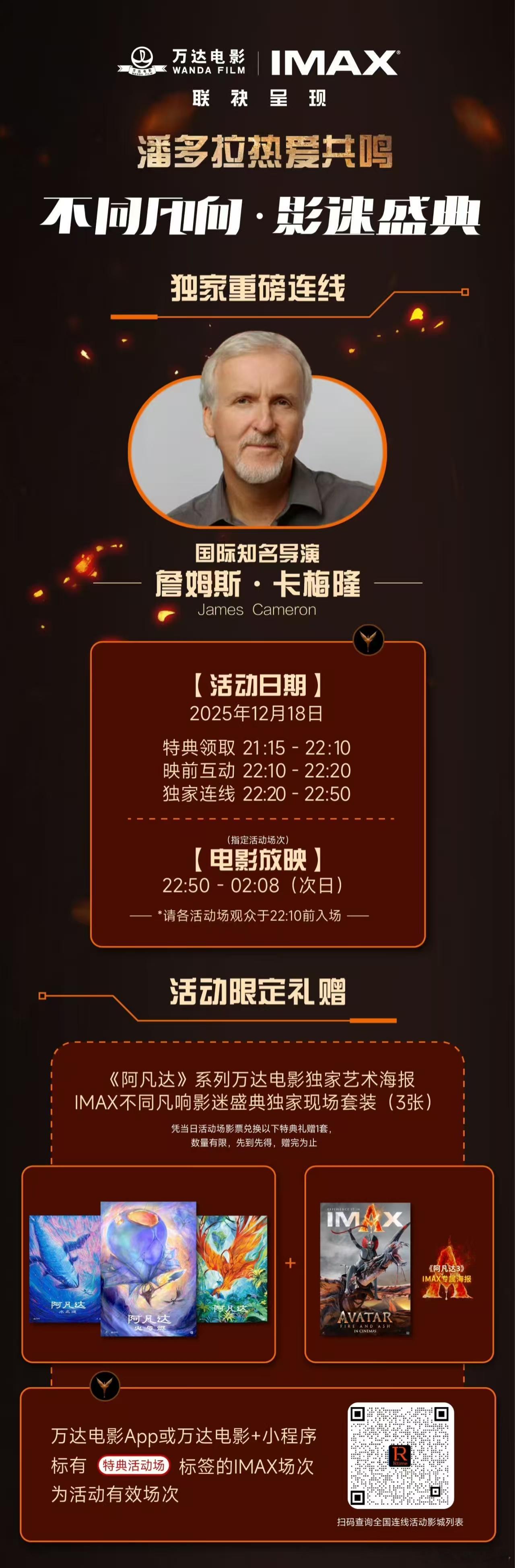 万达电影IMAX阿凡达3专属盛宴来啦!12月18日,万达电影与IMAX联手搞大事!东莞作为主会场,将迎来《阿凡达3》特殊放映,更有全球影坛的票房传奇导演卡梅隆视频连线答疑——这个开创3D时代、手握《泰坦尼克号》《阿凡达》系列等三部20亿+美元票房神作的传奇,要和中国影迷0距离对话,这样的机会堪称影迷超级福利!IMAX一直是3D电影的黄金拍档,当年它的进步直接催生了《阿凡达》的诞生。记得《阿凡达1》上映的时候,东莞的影迷曾奔走相告,一席难求。十六年过去,卡梅隆导演带着《阿凡达3》重回这里,与万达电影、IMAX一起,为我们准备了这场全新的视听盛宴——像是完成了一场漫长的约定。这次,200+万达影城&寰映影城IMAX厅同步联动,北京、上海还将开启阿凡达主题艺术展,无论身处何地都能沉浸式打卡。作为行业标杆,万达电影从不缺高规格操作:从《复联2》全民抢票的跨界盛宴,到东莞首家IMAX GT激光影厅焕新(银幕比篮球场还大,多40%画面+12.1声道环绕音效),每一次都刷新观影体验 。IMAX的极致视听搭配万达电影的硬核资源,让每部大片都能充分释放魅力。这次既能抢先解锁潘多拉新冒险,又能向卡梅隆提问,这样的重磅活动错过难再来!跨年电影愿2025年度电影结算画面大v荐电影