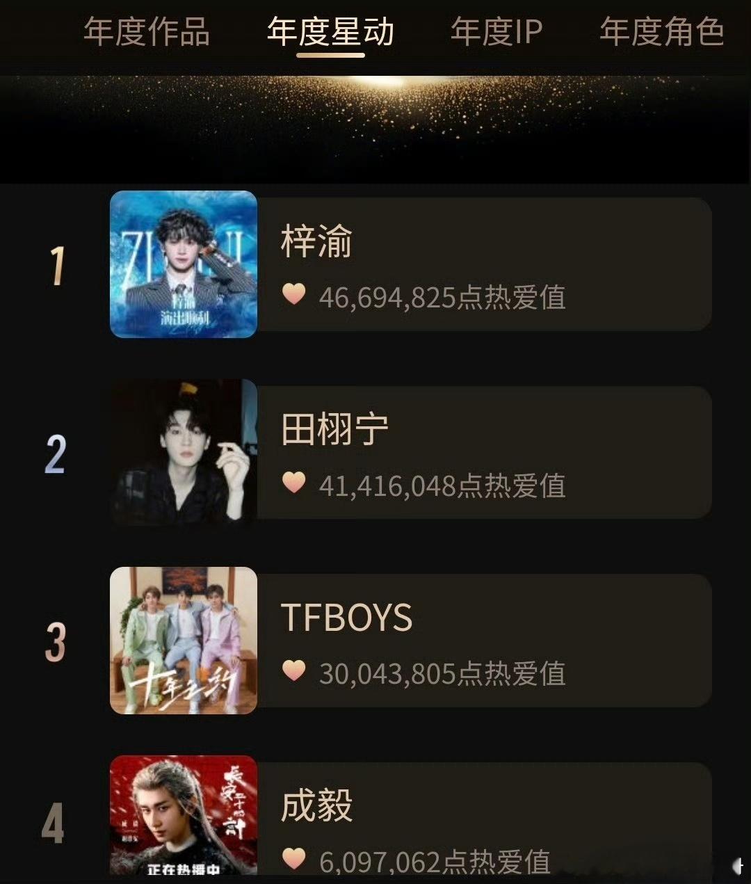超话大赏年度星动第一阶段投票TOP4:梓渝田栩宁TFBOYS成毅,你Pic