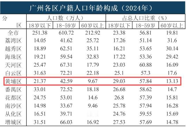 广州各区人口简析 1.根据2024年统计数据,白云区人口超过350万人,为人口第一大区,主要原因是白云区面积较大,约800平方公里,白云区南部与广州中心四区接壤,中北部有大片的城中村吸纳了大量打工人。番禺、天河紧随其后,人口超过了200万人。 介于100~200之间的区最多,黄埔区人口123.5万人位居中游偏下。而从化、南沙、越秀都不足百万人。 2.在广州11个区中,60岁以上户籍人口占比最高的两个区是荔湾区和越秀区,超过30%,而最低的区则是黄埔区,占比仅13.13%,人口越年轻,社会活力和经济潜力越强。黄埔是广州制造业密集区,吸纳了大量青壮年打工人。
