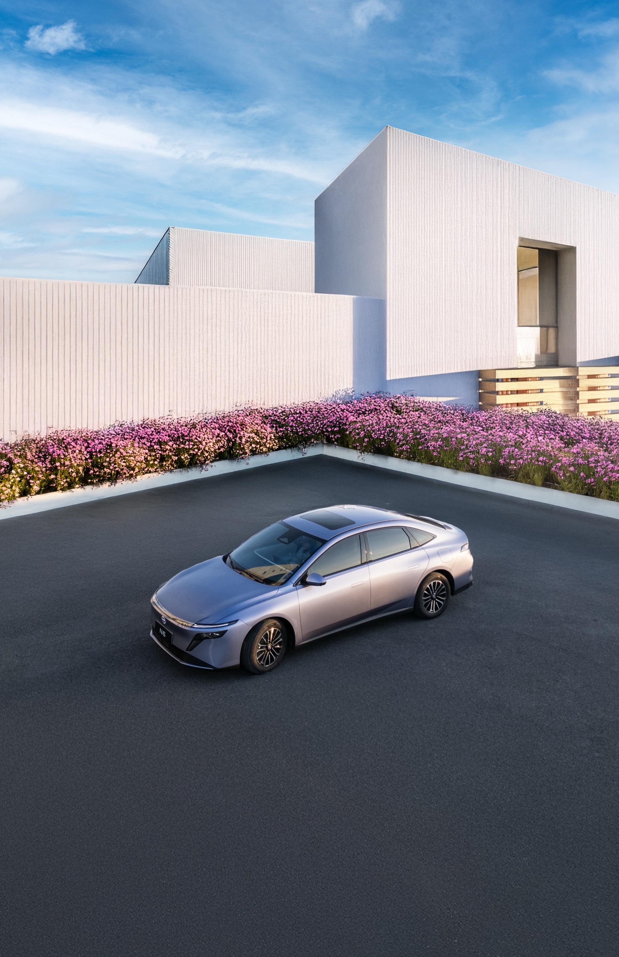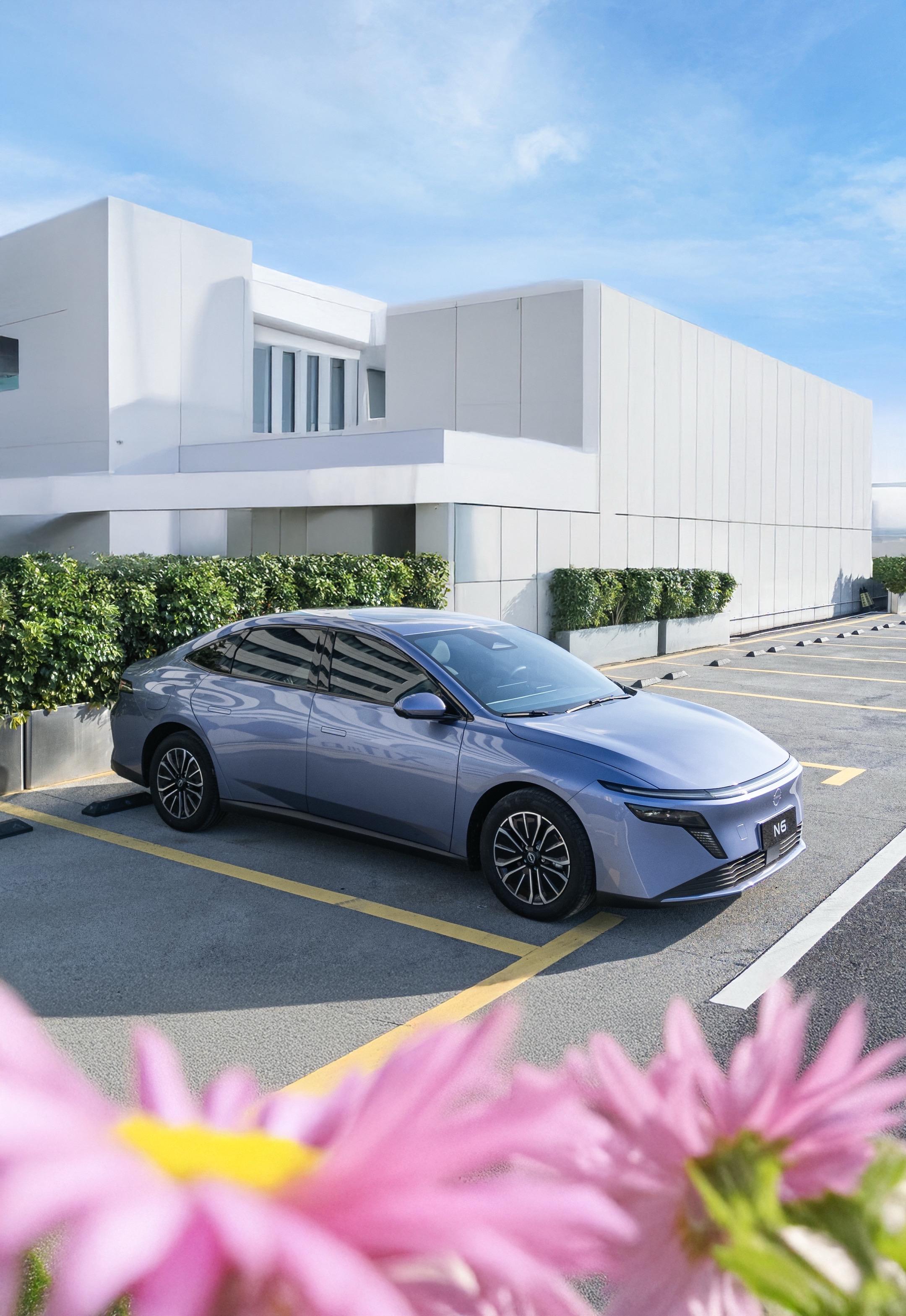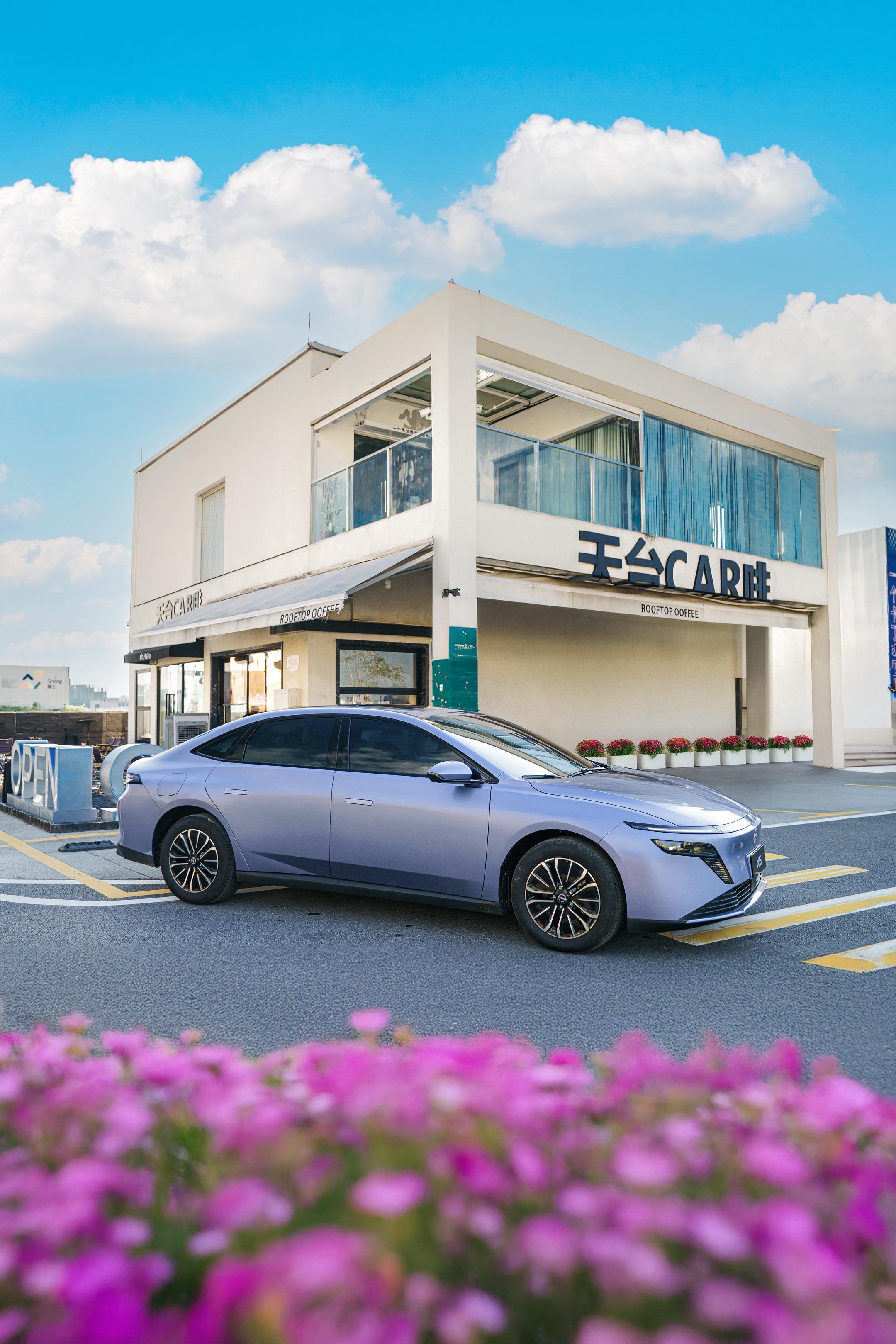 当N6风信紫遇上极简风小清新的门店,简约元素搭配蓝天,加之前景的花草做虚化,把车身衬得像漫画里的主角座驾,流线型车身和清新色调非常搭,色调出乎意料的适配,N6太出片了~