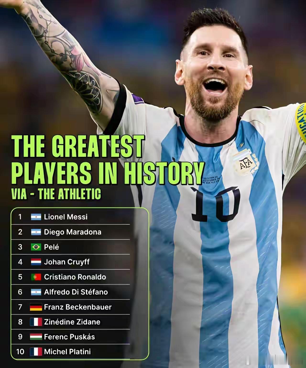 梅西第1,C罗仅第5,这份史上最强榜单真服气? 最近The Athletic放出史上最伟大球员前十。第1梅西,马拉多纳第2,贝利第3,克鲁伊夫第4,前四基本稳。第5只给C罗,五座金球还压不进前三?第7贝肯鲍尔,两金球加世界杯、欧洲杯,也显低。其余是迪斯蒂法诺第6、齐达内第8、普斯卡什第9、普拉蒂尼第10。更刺眼却是缺席:大罗、罗纳尔迪尼奥、哈维、伊涅斯塔全部没进。看味道,排序偏技术审美与传奇故事,普斯卡什、普拉蒂尼的美学分高。若更重数据与冠军密度,C罗、大罗应在前排,中场双核也该往前提,甚至有人会让普拉蒂尼或普斯卡什出列。总体不离谱,但很难服众。