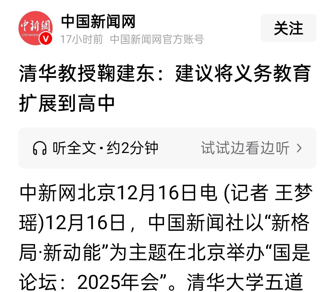 清华教授建议,高中纳入义务教育范畴。 等到这一波人口高峰过去以后,大学之前的教育都完全可以纳入到义务教育阶段。 校舍,老师,教学设备都是现成的,这已经具备了义务教育的足够的条件。 纵然是不纳入到义务教育阶段,老师的工资也得照发,校舍也会被闲置。 更重要的是,高中纳入到义务教育阶段以后,可能就没有今天的教育内卷了。 人人上高中,马上就实现人人上大学。既然人人都可以上大学,大学的招生标准自然也会发生相应的变化,大学之间的竞争对学生是有利的。 大学可以设置除了高考以外进入大学的办法。如此这般学生也可以不通过高考这一条路进入大学了。 高中纳入到义务教育阶段,学生在义务教育阶段的学业压力没有那么大了,更关注的是孩子自身的成长,而不仅仅是学习成绩的提升。 这样学生也不用焦虑了,家长也不用担心了,用在教育上的支出也大大缩减了。 普及高中只是第1步,把高中纳入到义务教育阶段,会对中国的教育产生深远的影响。
