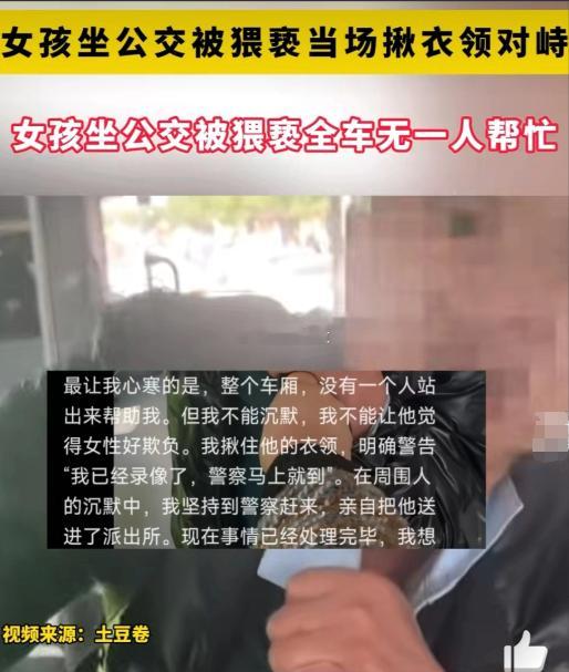 女孩回应坐公交被猥亵无一人帮忙 在公交车上遭遇猥亵,多数人选择隐忍,一名重庆女孩却选择了一种更勇敢、更清醒的方式反抗,她冷静拍下证据,当场对峙并报警,最终将猥亵者送进了派出所。然而,车厢里令人心寒的沉默,同样值得反思。面对猥亵行为,无人出声、无人上前,这种旁观者的冷漠,无形中助长了恶人的气焰。并非要求每个人都要上前搏斗,但一声呵斥、一个眼神、一句“需要帮助吗”,或许就能为受害者撑起一份勇气。猥亵者之所以嚣张,往往赌的是受害者的羞耻与周围人的沉默。这名女孩用行动证明:沉默只会助长恶行,勇敢发声、智慧取证才是保护自己的利器。