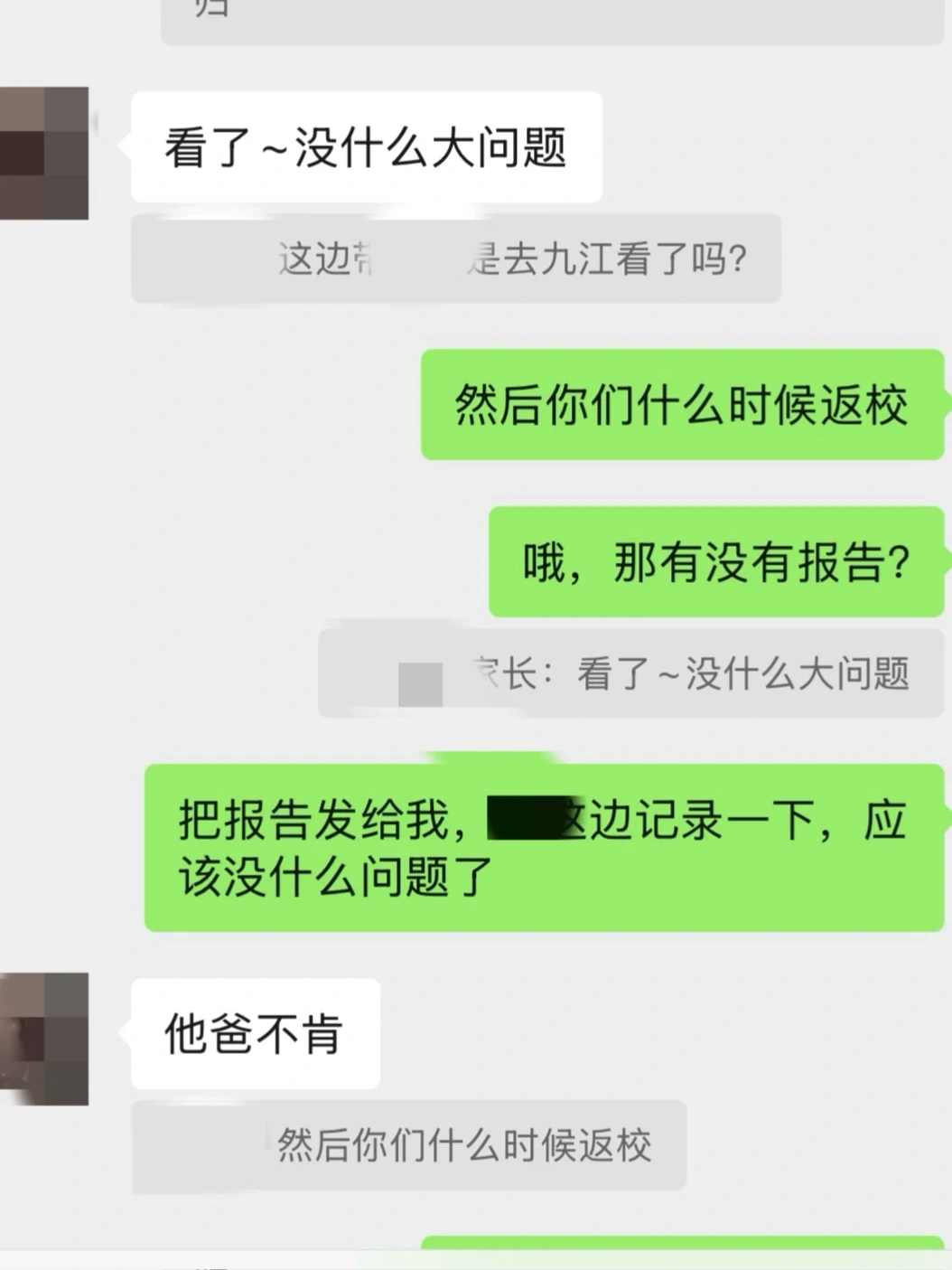 ▫️▫️学校为了撤诉,多次找到家长,家长还是不承认自己的孩子有问题,最后学校不得已让她转班,(我们班学生比较听话,家长也想给她换个环境)转到我班上以后,我要求弄一个安全信息档案,让家长带孩子去检查,拖拖拉拉说服了好久才肯带孩子去,到当地🏥去看了以后,结果当地都建议去上级🏥检查,问家长要检查结果,家长说检查没有任何问题,却不愿意出示报告。后面直接不来学校,说家长不肯让孩子来。把学校又j报了说学校以各种理由不让孩子返校!!说自己的孩子没有任何问题,在家里很听话,(很明显的看出撒谎)有时候真的不理解,家长的不负责,在很大程度上真的会害了孩子,就是不愿意承认孩子有问题!!
