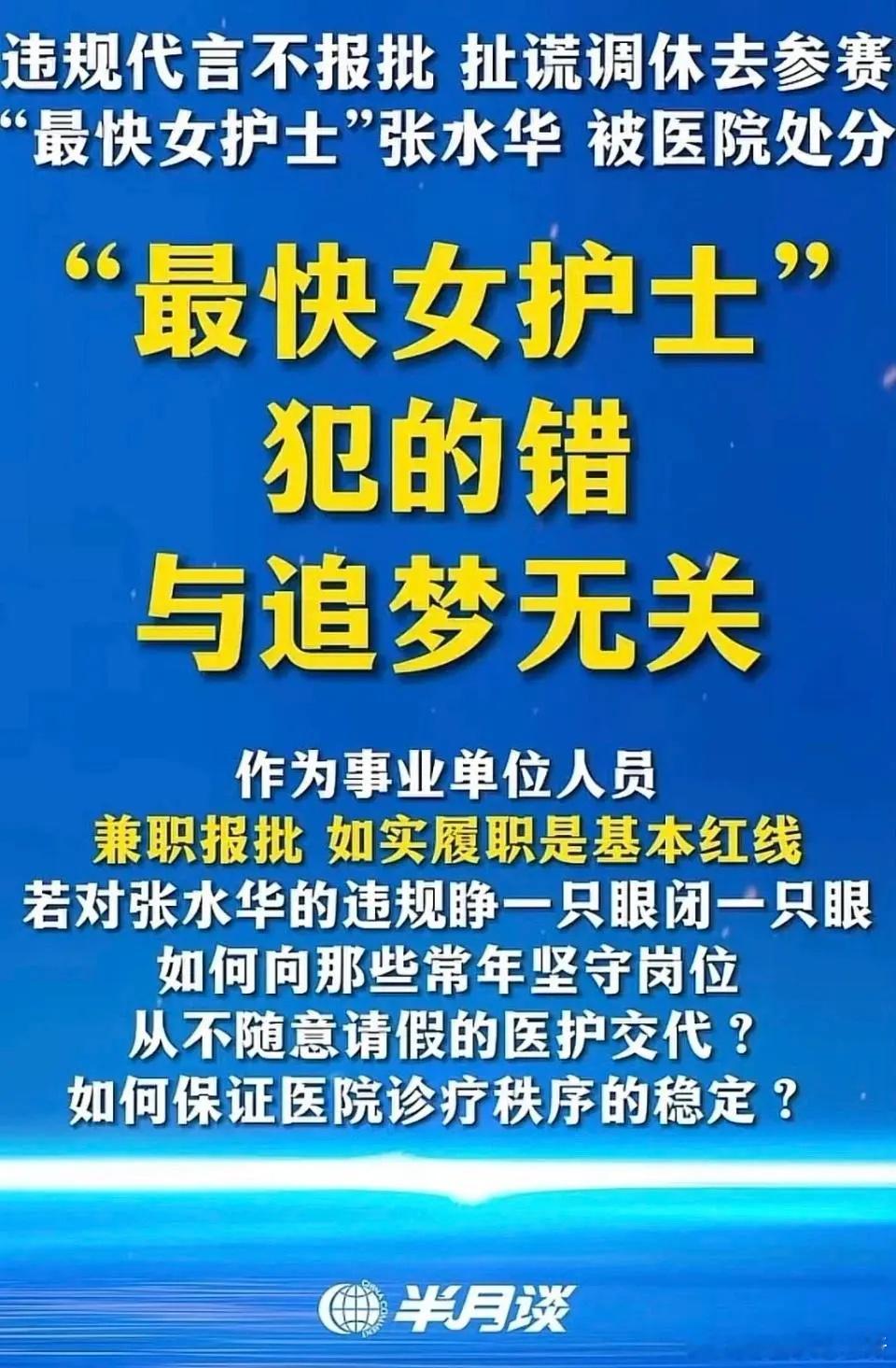 力挺张水华!白岩松翻车?央媒官媒反驳,博主:精致的利己主义者近日,“最快女护士”张水华被医院警告处分,引起热议。央视主持人白岩松力挺张水华,结果遭到多家媒体的反驳。白岩松认为,应该换个角度看问题:如果自己是医院的院长,会让张水华去医院工会,带动本院的医生护士参与跑步,鼓励她参赛,带动更多的福州人去参赛。对此,新华社主办的《半月谈》发文称:最快女护士犯的错与追梦无关,作为事业单位人员,兼职报批、如实履职是基本红线,若对张水华的违规睁一只眼闭一只眼,如何向那些常年坚守岗位、从不随意请假的医护交代?如何保证医疗诊疗秩序的稳定?江苏新闻点评道:白岩松提出了“更好的可能”,但却因忽略了“眼前的公正”而遭到全网的吐槽。张水华对马拉松的热爱难能可贵,但这件事情的核心从来都不是“梦想该不该追”,而是“代价由谁承担”。医疗行业事关生命安全,在这个特定的职业框架内,某些自由就必须让位于责任。如果不能守住职业责任的底线,不如毅然奔赴专业赛道,最艰难的往往不是选择,而是在选择之后,能否对自己诚实,对他人负责。《羊城晚报》发表评论称;白岩松的点评并不能自圆其说。不管张水华的马拉松成绩有多么亮眼,她就是一个在本单位犯了错误的护士。评价她的重点始终在于她是否尽到了一个护士的本分和职责。只有在这个前提下,其他讨论才是有价值、有意义的。光是编造虚假理由获取调休这一条,张水华就称不上一名好护士。白岩松建议让张水华减少当护士的时间,而去医院的工会。牵涉到一个单位具体的岗位设置、人手安排,真不是隔岸观火者随口扯扯那么简单。浙江宣传发文称:各司其职、不影响单位和他人是基本的职业道德,脱离了行业准则约束,所谓“市民的护士”便无从谈起。更何况,张水华所处的还是“性命攸关”的医疗行业,救死扶伤是本职工作,若兼职影响了本职,既是对本单位同事的不公平,也是对医院患者的不公平。若将自身特长异化为特权,要求组织或同事无条件让步配合,甚至利用网络舆论倒逼单位给自己“开绿灯”,这种精致利己主义的认知和行为不仅会破坏职场氛围,为个人发展制造障碍,也更容易产生不少本可避免的职场矛盾。规则之内的“特殊”安排,是对人才的珍惜;规则之外的“特殊”对待,则是对公平的伤害。知名博主韦观认为:张水华不可能占着护士的岗位,拿着医院的工资福利,还可以随意地去做所谓自己喜欢的事,这是又当又立。医院的岗位设置、工作分配难道是儿戏,想怎么样就怎么样?不客气地说,白岩松言论的背后就是精致的利己主义思维,纯粹的为女护士个人利益最大化考量的,至于基本的制度、规范都是不考虑的,公共的利益,也是不用考虑的。