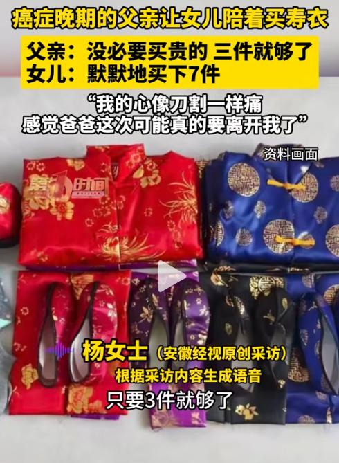 泪目!重庆一父亲肝癌晚期,在医院打完止痛针后,突然提出,让女儿陪他出去买寿衣,不料,到店里之后父亲说:“没必要买贵的,买3件就够了!”但是,女儿却默默买了7件,女儿坦言:“心像刀割一样痛,感觉爸爸这次可能要离开我了!” 当父亲平静地说出“寿衣”两个字时,女儿的心猛地一沉,脑子里一片空白。病房里消毒水的气味似乎更重了,旁边仪器的滴答声格外清晰。 从确诊肝癌晚期那天起,已经过去了三个月。女儿以为自己已经做好了心理准备,可当父亲亲自、清醒地安排身后事时,心里的防线还是彻底垮了。 她想说“爸,别乱想”,也想劝“我们好好治病”,但话堵在喉咙里,一句也说不出来。看着父亲因病而消瘦的脸,她清楚地意识到,说什么都没有用了。 寿衣店里光线有些暗,空气里有陈年布料和樟脑混合的气味。架子上挂着各式各样的衣服,款式、面料、颜色,都透着人生的最后一程。 “就这个吧,不用挑贵的,三件就够了。”父亲走得很慢,一件件看过去,眼神平静得像是在挑一件平常的冬衣。他没有问价格,也没有比较花纹,只是指了指其中一套最朴素的。 女儿站在一旁,听到这句话,指甲不知不觉掐进了手心。她没有接话,也没有反驳,只是转过头,轻声对店主说:“麻烦您,给我们拿七件。”这是她还能为父亲做的、为数不多的事情。 回去的路上,天色有些暗了。父亲似乎完成了一件重要的事,精神反而比在医院时轻松了一些。他望着车窗外掠过的街景,平静地交代:“以后就把我埋回老家那个山坡上吧,向阳的那面,清净。”女儿听着,已泪流满面。 人生就像搭一列很长的火车。你的父母、家人,就是一开始陪你上车、坐在你旁边的人。一路上,他们照顾你,陪你看窗外的风景。你习惯了他们在身边,以为这趟旅程会一直这样。 直到某个站台,你发现,他们到了该下车的时候了。 这个时刻来临前,往往会有很多“铺垫”。就像故事里,父亲亲自去挑选最后的衣服。这些事听起来很沉重,但换个角度想,这也是生命留给我们好好告别的机会。 很多人没有这样的机会,“啪”的一下,人就走了,那才是永远的遗憾。所以,能有机会好好告别,其实是一种幸运。 面对离别,我们唯一能做的,不是将他们强留在站台上,而是将他们好好放在心里,然后带着他们的祝愿,继续走向自己的远方。 信息来源:AHTV第一时间 文|晓晖 编辑|南风意史