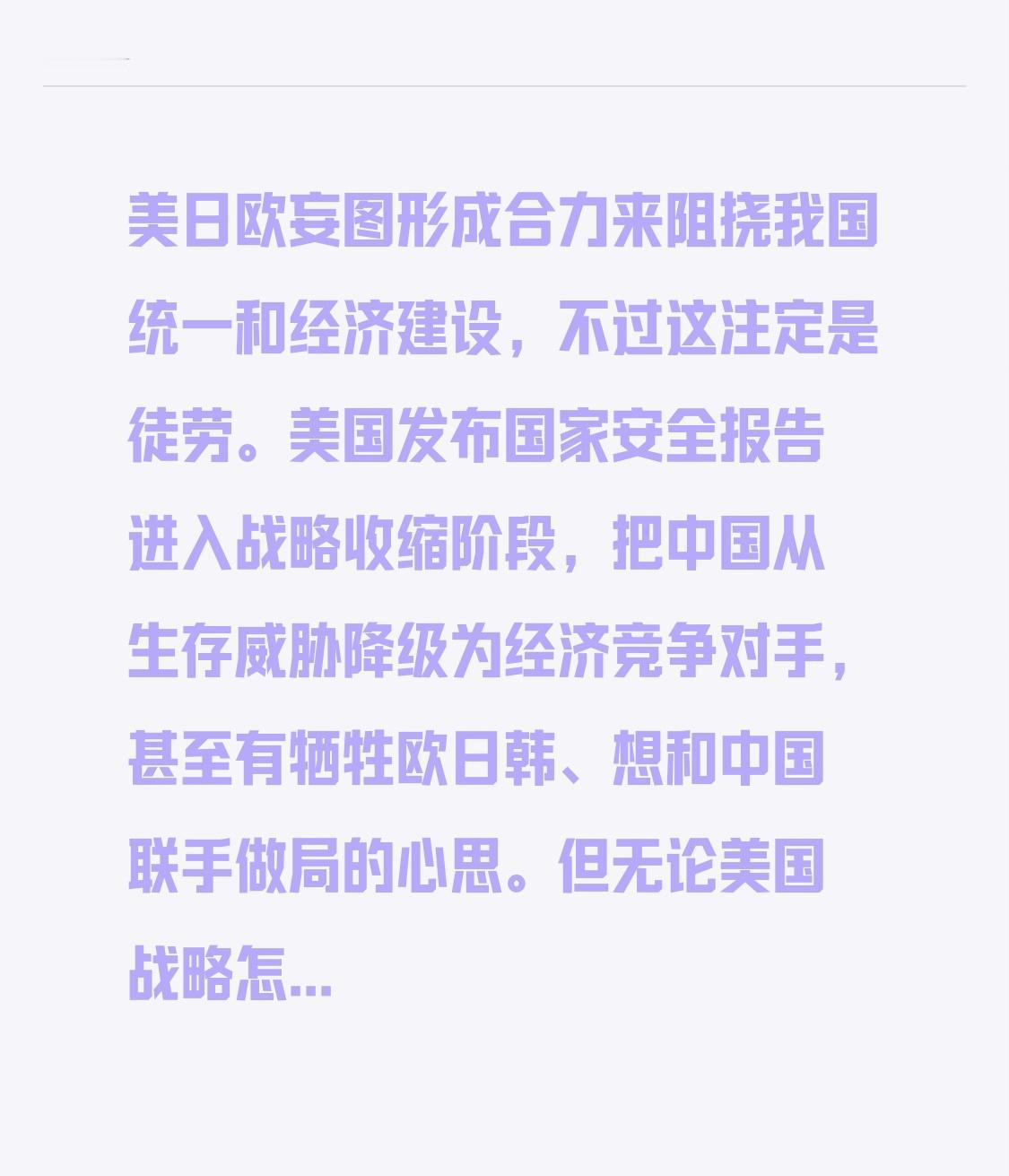 美日欧妄图形成合力来阻挠我国统一和经济建设,不过这注定是徒劳。美国发布国家安全报告进入战略收缩阶段,把中国从生存威胁降级为经济竞争对手,甚至有牺牲欧日韩、想和中国联手做局的心思。但无论美国战略怎么变,我们中国始终行大道,坚定自己的步伐。 “不为一时一事所惑,不为风高浪急所扰”,我们对国际形势有深刻判断,不会被美日欧的小动作干扰。中国的发展和统一是历史大势,任何外部势力都无法阻挡,我们永不怕鬼更不信歪,必将实现国家的完全统一和经济的持续腾飞。