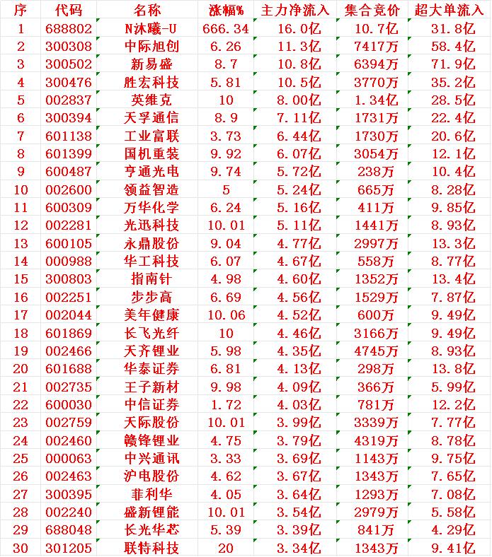12月17日尾盘30分钟,主力资金“大幅抢筹的”30名单一览! N沐曦-U:净流入16.0亿元,集合竞价成交高达10.7亿元 中际旭创:净流入11.3亿元,集合竞价成交7417万元 新易盛:净流入10.8亿元,集合竞价成交6394万元 胜宏科技:净流入10.5亿元,集合竞价成交3770万元 英维克:净流入8.00亿元,集合竞价成交1.34亿元