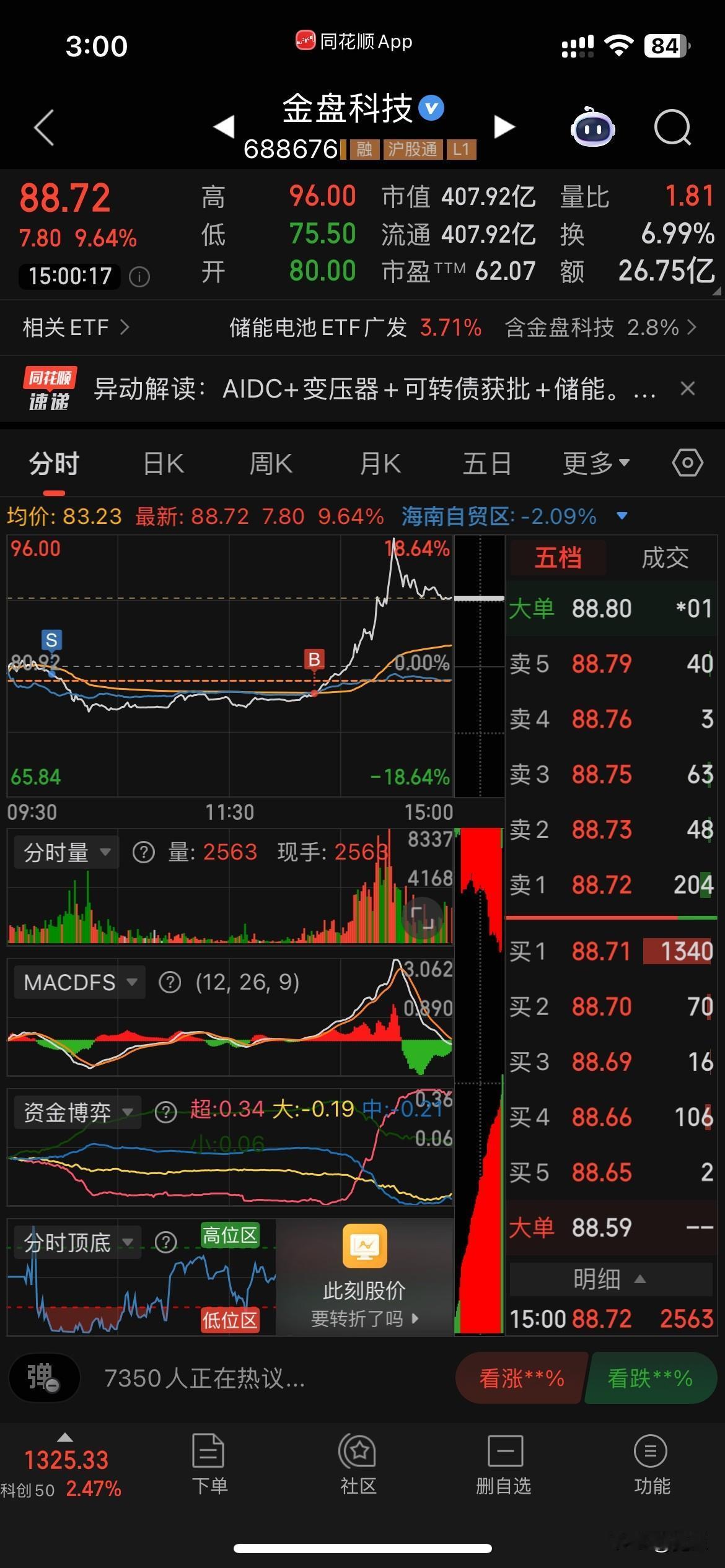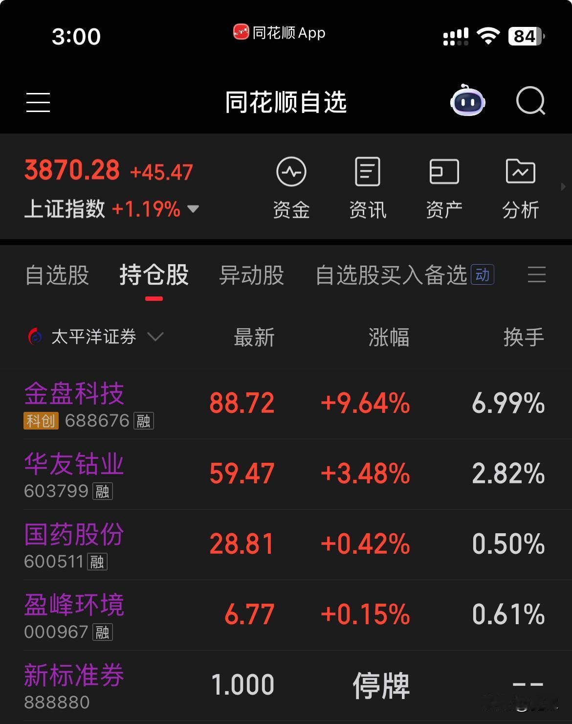 下午风云突变,大盘还在缩量的情况下1:40左右横空爆拉。我估计大部分人都措手不及。我紧盯金盘及时出手,赶上了这趟车[捂脸]。由于不能卖出只能眼巴巴看它尾盘掉落下来。盈峰还是我行我素,好像跟大盘没有关系一样,怪异得很。收盘今天盈利3千6。好久没有这么多了。 不知道是什么力量,国家队进场了吗?