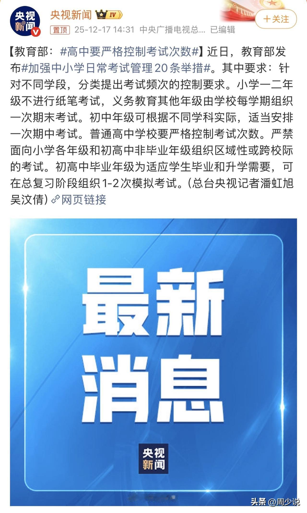 重大利好消息!教育部发布中小学考试管理20条举措,多条要求直击家长痛点。新规明确按学段控考:小学一二年级取消纸笔考试,义务教育其他年级每学期仅1次期末考试;初中可按需加1次期中考试,普通高中则严控考试次数。同时严禁给小学各年级、初高中非毕业年级组织区域性、跨校考试,初高中毕业生总复习阶段最多考1-2次模拟考。 看了这个举措,周少认为教育部控考核心是为了给学生减负,打破“以考代练”的内卷模式,让教育回归知识掌握本身而非分数竞争。 但减负不是取消考试,合理的考试仍是学情反馈的重要手段,后续更需监管学校落实情况,避免“换名考试”“私下加考”。 同时,家长也要调整心态,重视孩子学习习惯和综合能力培养,而非单纯紧盯考试分数,这样才能真正让减负落地,还给孩子轻松且高效的学习环境。 对于教育局宣布高中要严格控制考试次数,大家怎么看呢?#寻美三湘# #长沙新朋友#