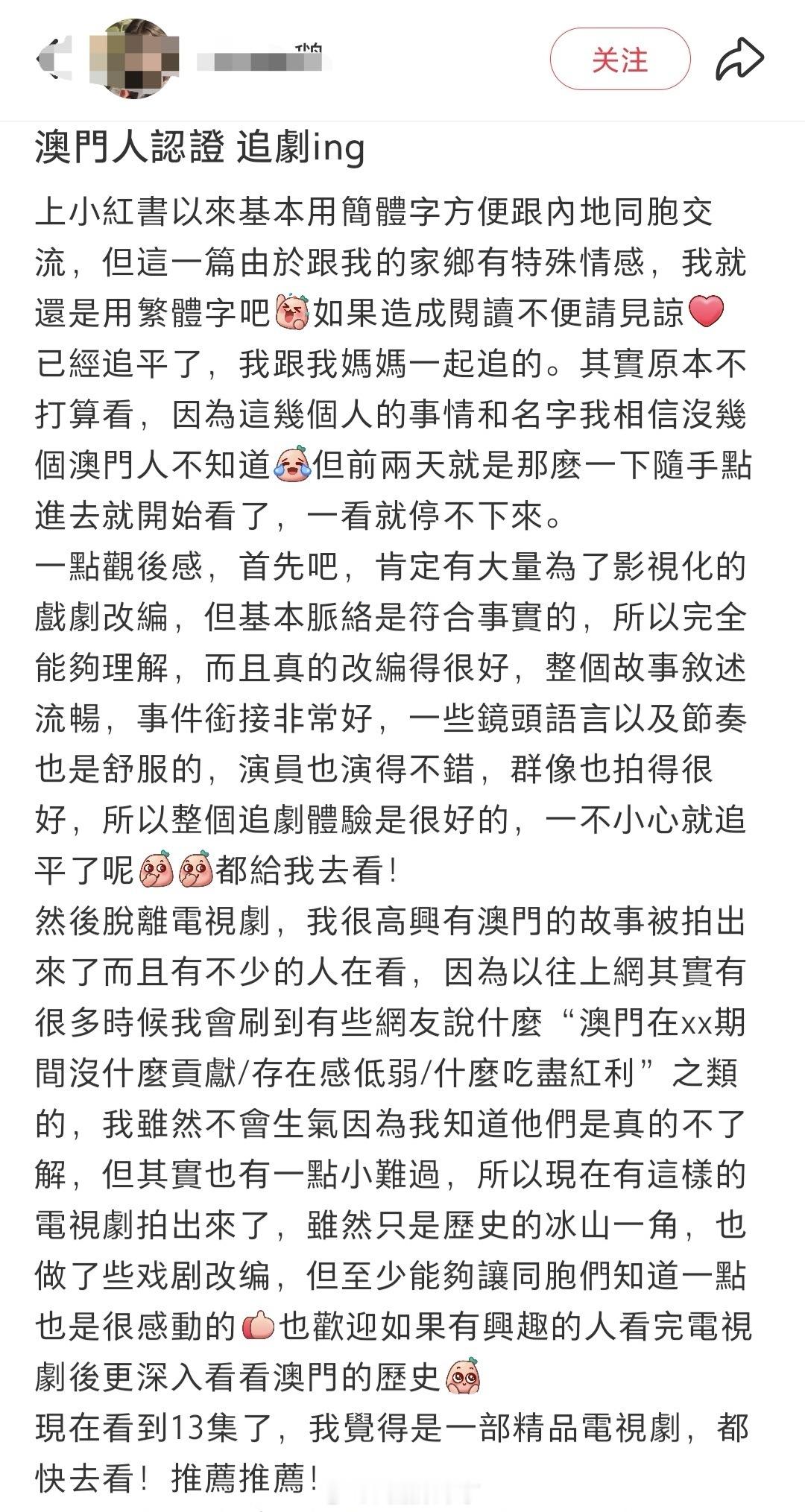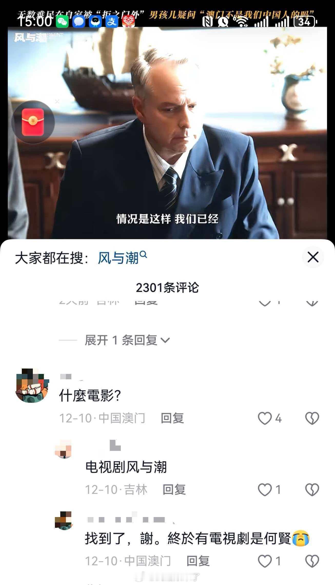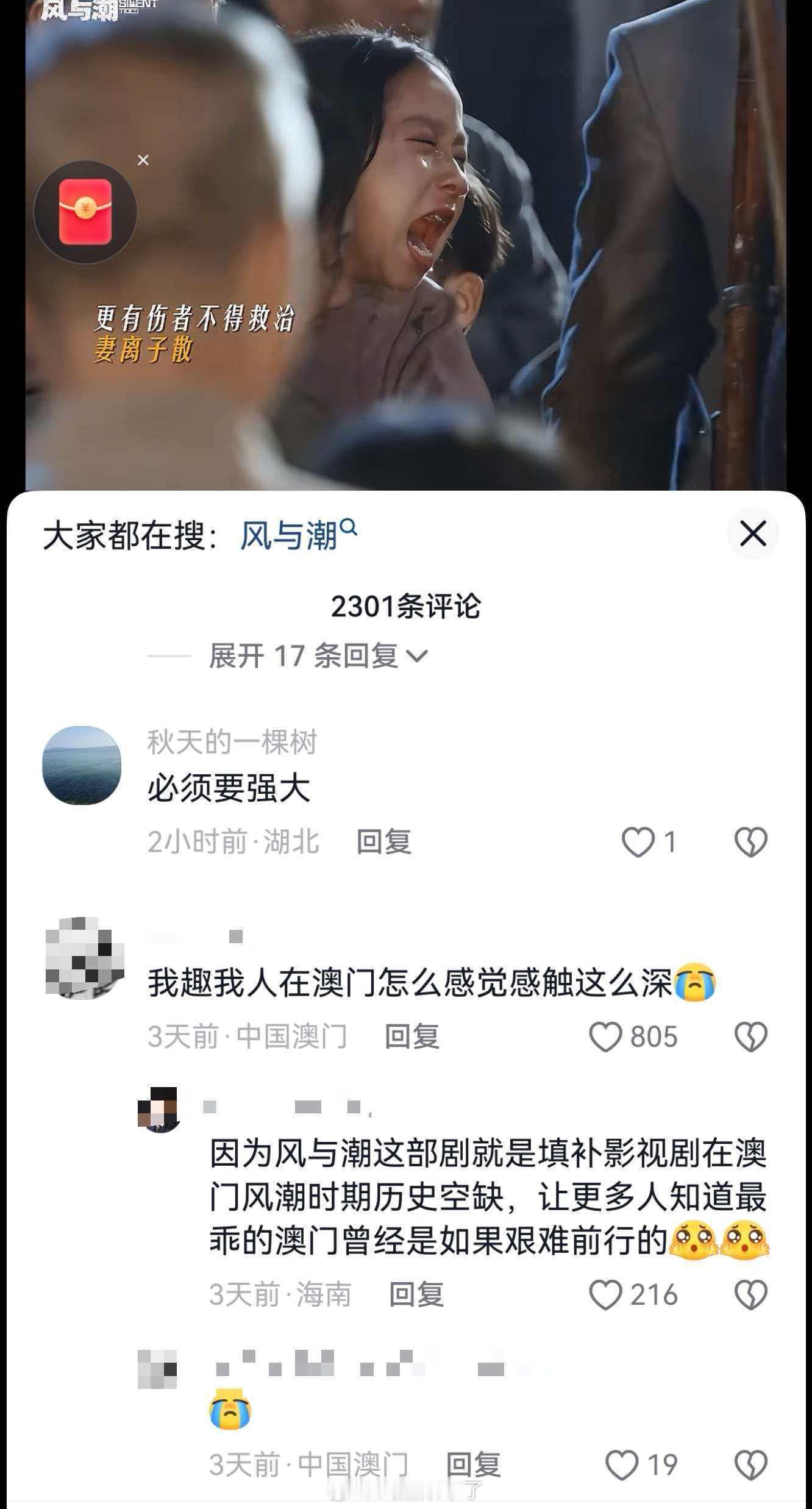 澳门同胞看《风与潮》,“一看就停不下来”。“终于有电视剧是何贤”《风与潮》这部剧填补了影视剧在澳门风潮时期的历史空缺,对澳门同胞而言,意义更显重大!任嘉伦风与潮