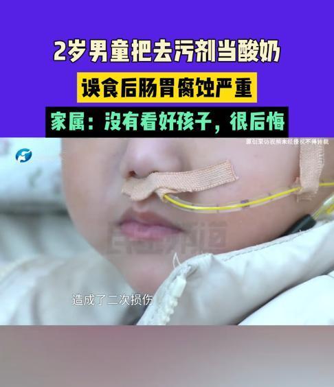 悲剧发生了!2025年9月,河南郑州,一老人打扫卫生时,随手将去污剂放在柜子上,孙子以为那是好吃的,便爬上去喝了一口,结果口腔、食管严重溃烂,老人发现后急忙给孙子灌水漱口,没想到却造成二次损伤!网友:家长的心真大! 很多家庭中,尤其是厨房,都有特别难清理的污渍,为此,不少人会去购买相关的去污产品,但是这些产品都是化学试剂,对于人体具有一定的危害,大人自然不会乱碰,但小孩子就不一定了。 事发当天,老人正在家里大扫除,将犄角旮旯都打扫了一遍,为了更好的清除掉污渍,她还使用了去污剂。 结果小孙子以为那是酸奶,就搬来板凳爬了上去,成功拿到了去污剂,刚喝了一口,小孙子就疼得哇哇大哭起来,老人发现后立即赶来查看情况。 由于自己也是第一次遇到这种情况,老人便接来清水,灌进孩子口中给他漱口,结果孩子哭得更加厉害了,老人急忙将孙子送去医院治疗。 医生检查后发现,老人灌下去的水将去污剂带到了更深的位置,给孩子造成了二次损伤,好在经过医生的不懈努力,孩子没有生命危险,但后续仍需要长时间的住院并进行手术! 当家长的一定要牢记,不要把家中的危险品放在孩子能够接触到的地方,毕竟孩子小不懂事,万一接触到皮肤或者误服,那后果不堪设想。 信息来源:《河南新密:2岁男童把去污剂当酸奶,误食后肠胃腐蚀严重,家属:没有看好孩子,很后悔》河南广播电视台民生频道