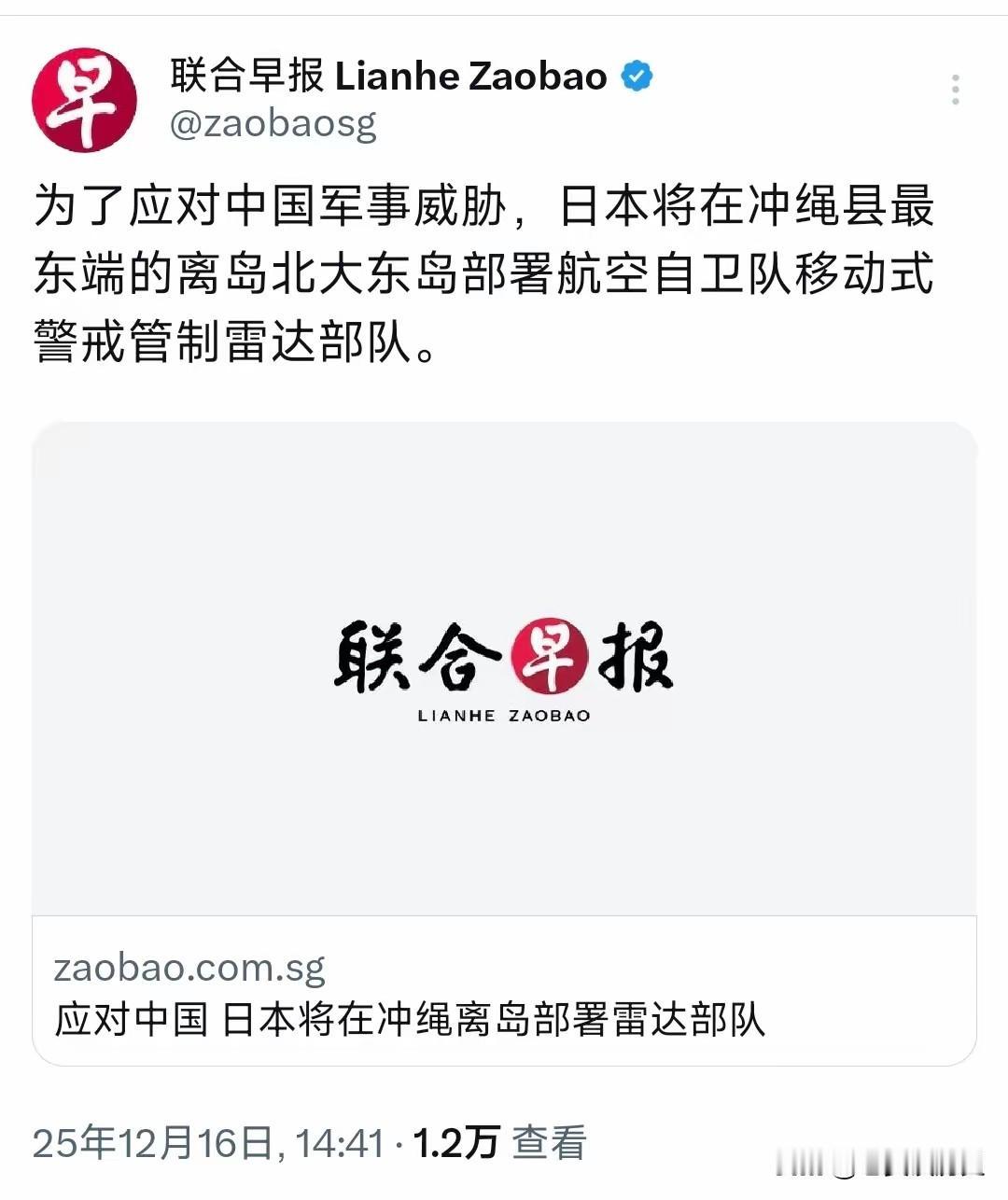 新加坡联合早报今天(12月16日)报道:“为了应对中国军事威胁,日本将在冲绳县最东端的离岛北大东岛部署航空自卫队移动式警戒管制雷达部队。” 看吧,日本自卫队的雷达车,又要开上新的小岛了。 这次选中的是冲绳最东边的北大东岛,一个只有几十平方公里、数百名居民的小地方。岛上马上就要进驻大约30名自卫队员,东北和南部约11公顷的土地已经被租下,新年一过就动工建营地、装雷达。 日本人说,这是为了填补太平洋岛屿的“警戒监视空白”。他们盯着的,正是那片中国海军舰机进出太平洋的蔚蓝海域。 可这仅仅是一部雷达的事吗? 远远不是。如果你摊开一张西南诸岛的地图,一股寒意会顺着脊背爬上来。过去的十年里,从最西边紧挨着台湾的与那国岛,到宫古岛、石垣岛、奄美大岛,自卫队的基地、导弹和雷达如同雨后毒菇般冒了出来。 与那国岛距离台湾仅110公里,那里已经部署了中程防空导弹。石垣岛上,反舰导弹和防空导弹赫然在列。现在,雷达的触角又伸到了最东端的北大东岛。 一个以冲绳本岛为中心,南北呼应、攻防兼备的“岛屿军事堡垒链”,已经悄然成型。 军事专家看得透彻:部署这些雷达,根本不是为了“看家护院”那么简单。那双“眼睛”背后,连着锋利的“牙齿”。对空雷达能引导F-35隐身战机发起攻击,对海雷达则为射程更远的改进型导弹提供目标指引。 这已经完全脱离了“专守防卫”的包装,是在明目张胆地构建进攻性的远程火力打击体系。 更危险的信号,藏在日本政客的话语里。 就在不久前,日本防卫大臣跑到与那国岛,言之凿凿地推进导弹部署。而当被问及这是否为“台湾有事”做准备时,他却玩起了外交辞令,拒绝回答。 这种沉默,比叫嚣更令人警惕。它默认了那个危险的假设,并正为此加紧实战准备。 对于这一点,中方的警告一次比一次严厉。 中国外交部发言人早已点破:日本在中国台湾邻近的西南诸岛部署进攻性武器,是在刻意制造地区紧张,挑动军事对立。联系到日本高层频频发表的涉台错误言论,这种动向“极其危险”。 历史的教训并不遥远。日本大幅增加防卫预算、放宽武器出口、甚至有人鼓噪修改“无核三原则”,这些强军扩武的危险态势,正在将和平宪法架空。 冲绳当地民众的恐惧,却被东京的决策者们轻易忽略了。 在部署说明会上,北大东村的居民们忧心忡忡地问:今天来的是雷达,明天来的会不会是导弹?我们会不会变成下一个与那国岛? 防卫省官员的保证苍白无力。在既定的战略野心面前,这样的承诺不堪一击。冲绳,这片饱受战争创伤和美军基地困扰的土地,正被迫绑上新的战车。 从地图上的一个点,到连成的一条线,再到试图掌控的一个面。日本在西南诸岛的每一步落子,都在加剧这片海域的惊涛骇浪。 这不再是单纯的军事部署,而是一场危险的战略赌博。它赌上了地区的和平稳定,也将自己再次推向了历史路口的悬崖边缘。 各位读者你们怎么看?欢迎在评论区讨论。 冲绳现状 冲绳局势 冲绳安全危机 东京冲绳 冲绳诸岛