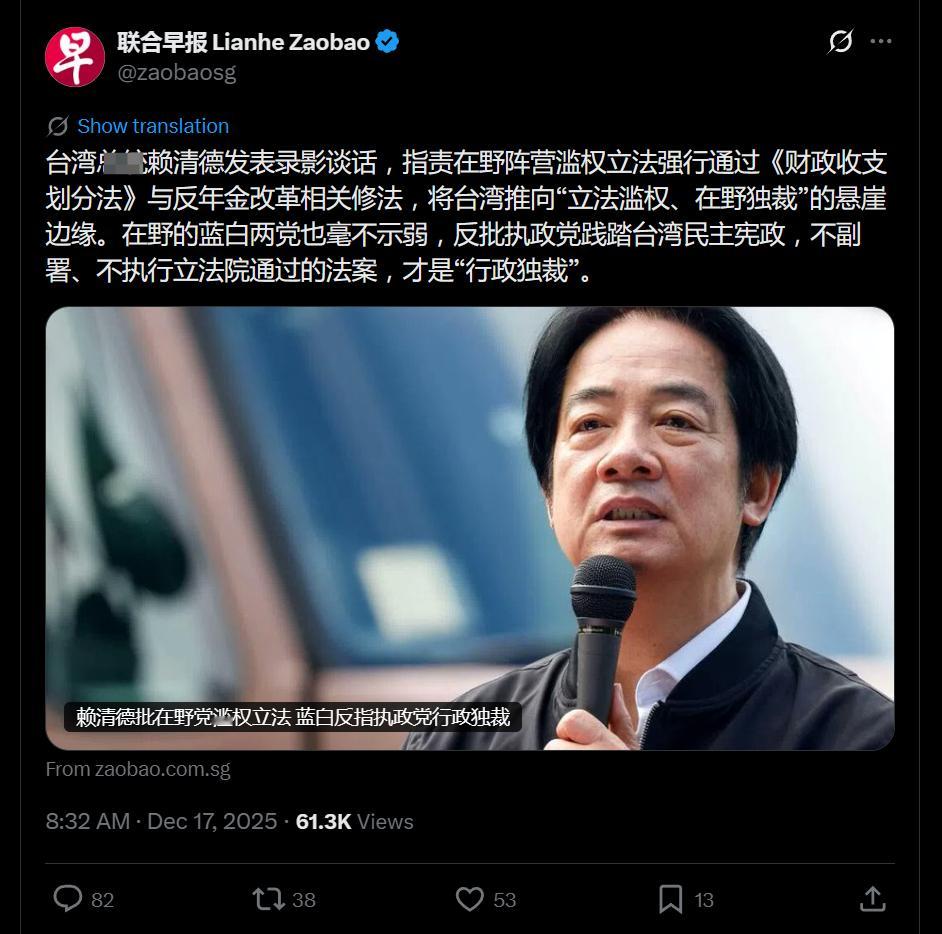 在发明了旗鱼人以后,今天赖子哥发明了震撼宇宙的新词“在野独裁”,成为岛内今日难绷