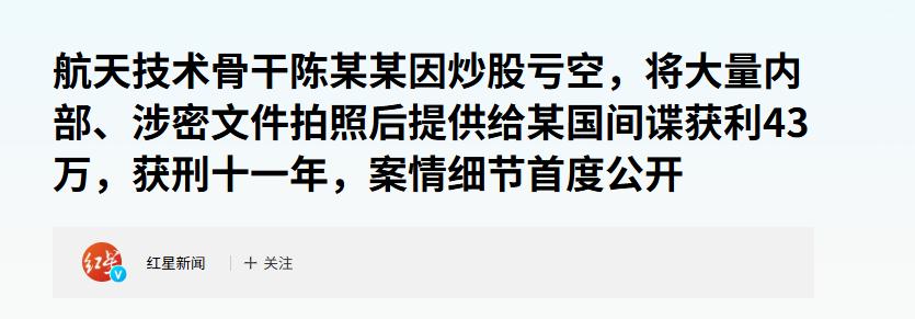 航天安全不容小觑!2025年12月15日,国安部披露载人返回舱等关键设备成境外势力觊觎目标,技术骨干成内鬼! 国家安全无小事,近年来境外间谍的活动越发的隐蔽,很有可能就隐藏在我们的身边。他们的身份超人想象,有看上去非常老实的普通人,也有一些技术骨干。他们藏在我国的各行各业中,都担任着不同的身份。 而在诸多的身份中,应该高度关注的就是技术人员。这些技术人员掌握着很多核心的成果,所以他们一旦泄密,就有可能会给我国带来致命的危机。 就在2025年12月15日的时候,据媒体报道,陈某某作为航天领域的技术骨干,先后就职于多家航天科研院所。 但就在2012年的时候,他却选择与境外的间谍组织勾结,之后搜集情报并进行传输。大概是良心过不去,所以后来他主动切断了联系。 直到2018年的时候,因为炒股亏损了数十万元,他才再度联系上了该间谍机构。在之后的三年时间里,他数次泄密。最终被判处了有期徒刑11年,剥夺政治权利四年。 陈某某的这件事情进一步证明,国外间谍机构已经高度紧盯我国的航天领域。就在同一日,国安部就首次披露了载人返回舱,火箭逃逸塔等一些关键的设备技术,已经成为了境外势力重点关注的目标。 也就是说,在航天领域可能不止一个“陈某某”。而其他的领域,或许也存在着“陈某某”。国家安全从来都不是小事,不要为了一己私利,选择背叛国家。作为中华儿女,面对诱惑应坚守底线。 对此,您怎么看? (信息来源:国安部:载人返回舱、火箭逃逸塔等关键设备技术成为境外势力重点觊觎的目标-观察者网) (信息来源:航天技术骨干陈某某因炒股亏空,将大量内部、涉密文件拍照后提供给某国间谍获利43万,获刑十一年,案情细节首度公开-红星新闻)