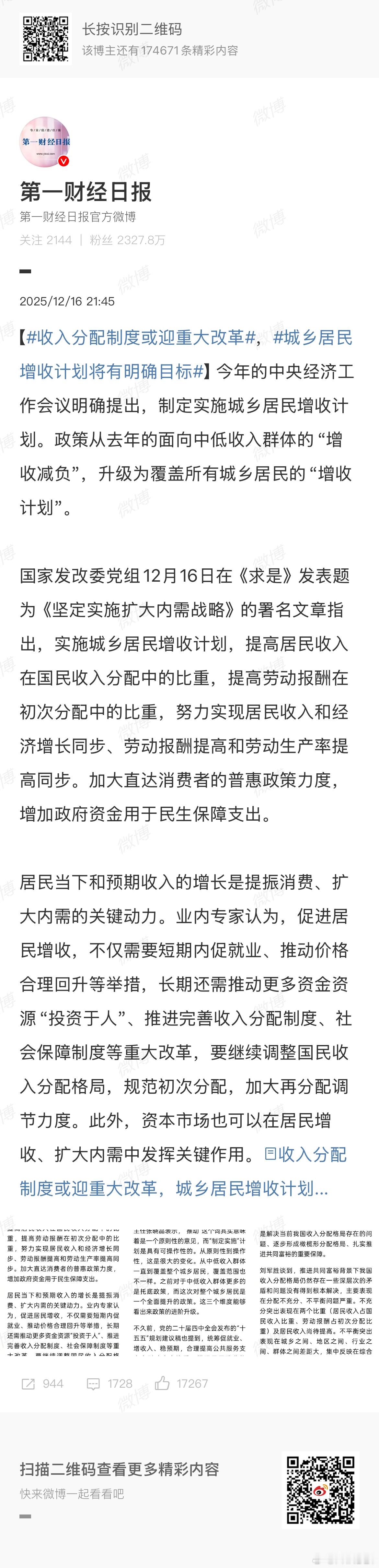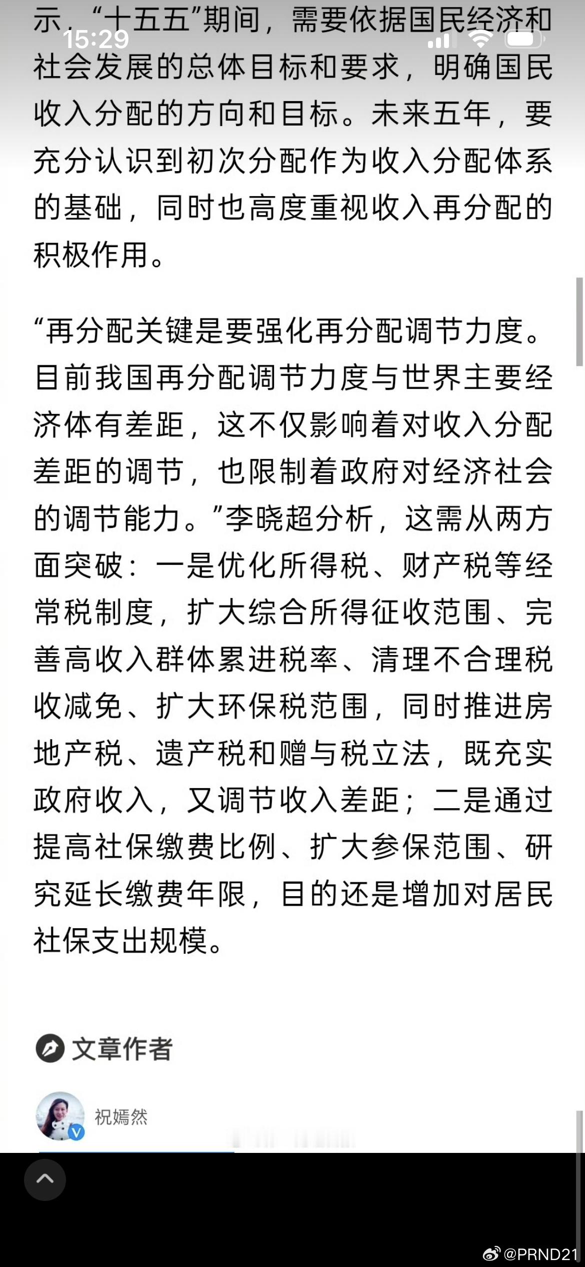 收入分配制度或迎重大改革 最后这一段我有一点没看懂,不过“扩大综合所得征收范围、完善高收入累进税率、清理不合理税收减免、扩大环保税范围、推进房地产税/遗产税/赠予税立法、提高社保缴费比例、研究延长缴费缴费年限”这些,应该是比较明显的加税信号吧……
