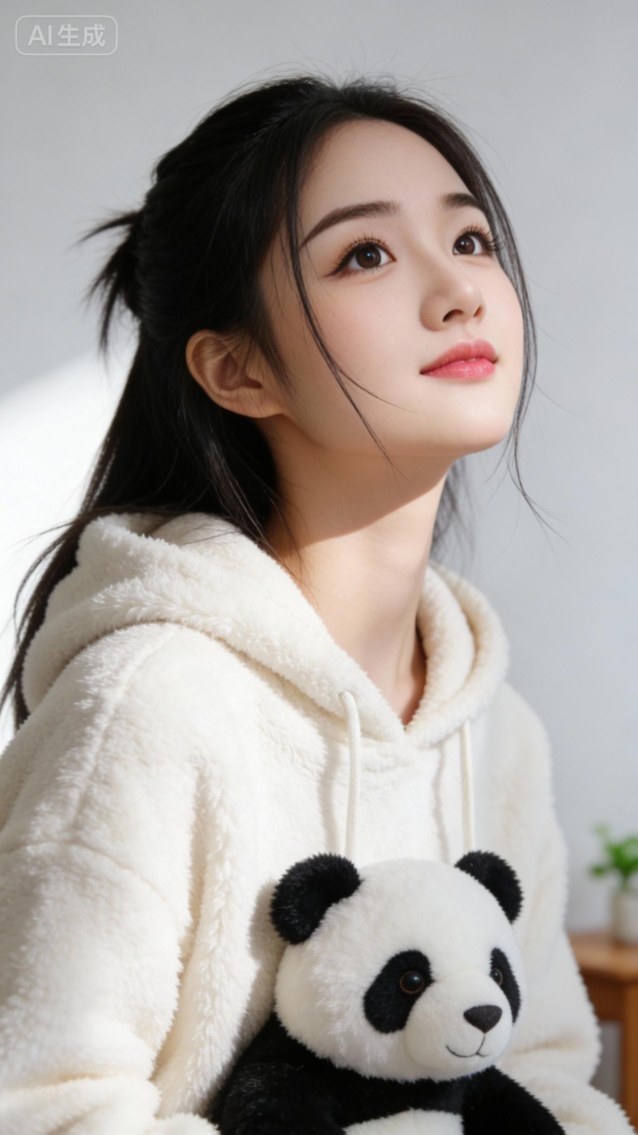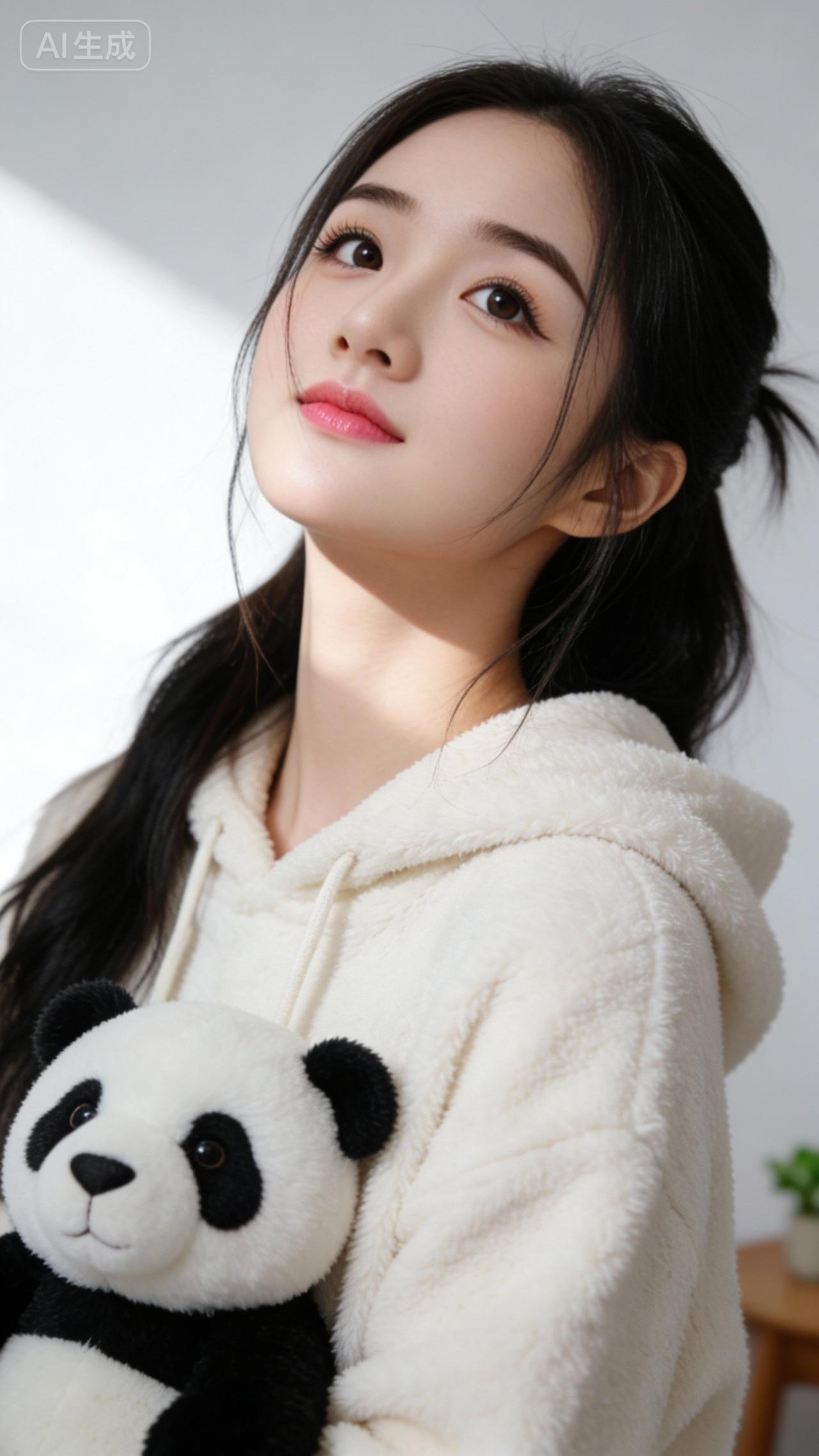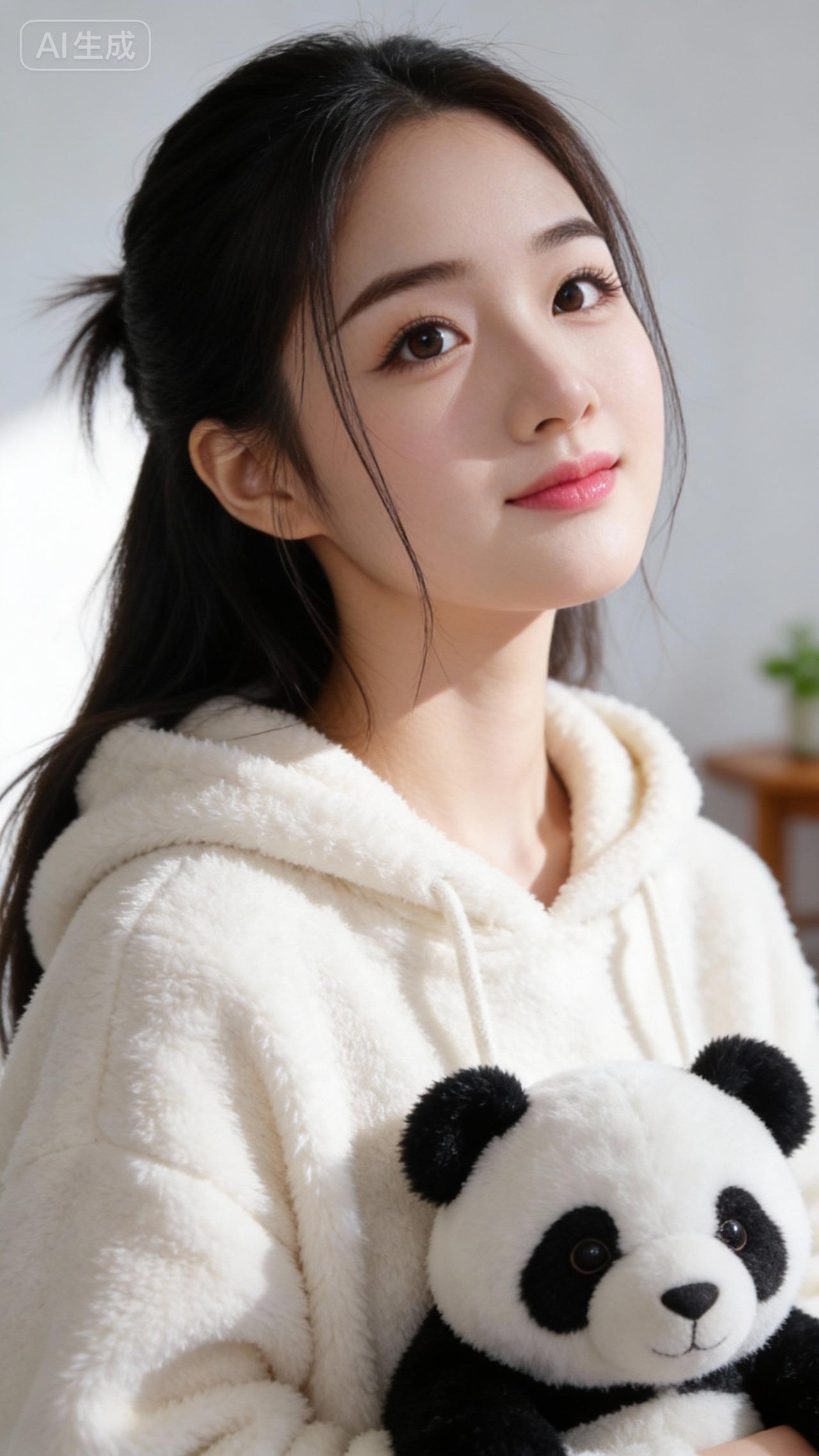 一位年轻的东亚少女,五官精致清丽,柳叶眉搭配灵动的杏眼,眼尾微微上挑,卧蚕明显,鼻梁小巧挺拔,唇形饱满涂着淡粉色唇釉,皮肤白皙通透;黑色长发半扎起,几缕碎发垂在脸颊旁,发丝有自然的光泽感;身穿米白色毛绒连帽衫,面料蓬松柔软,胸前抱着一只黑白熊猫毛绒玩偶,玩偶的耳朵和眼睛清晰立体。