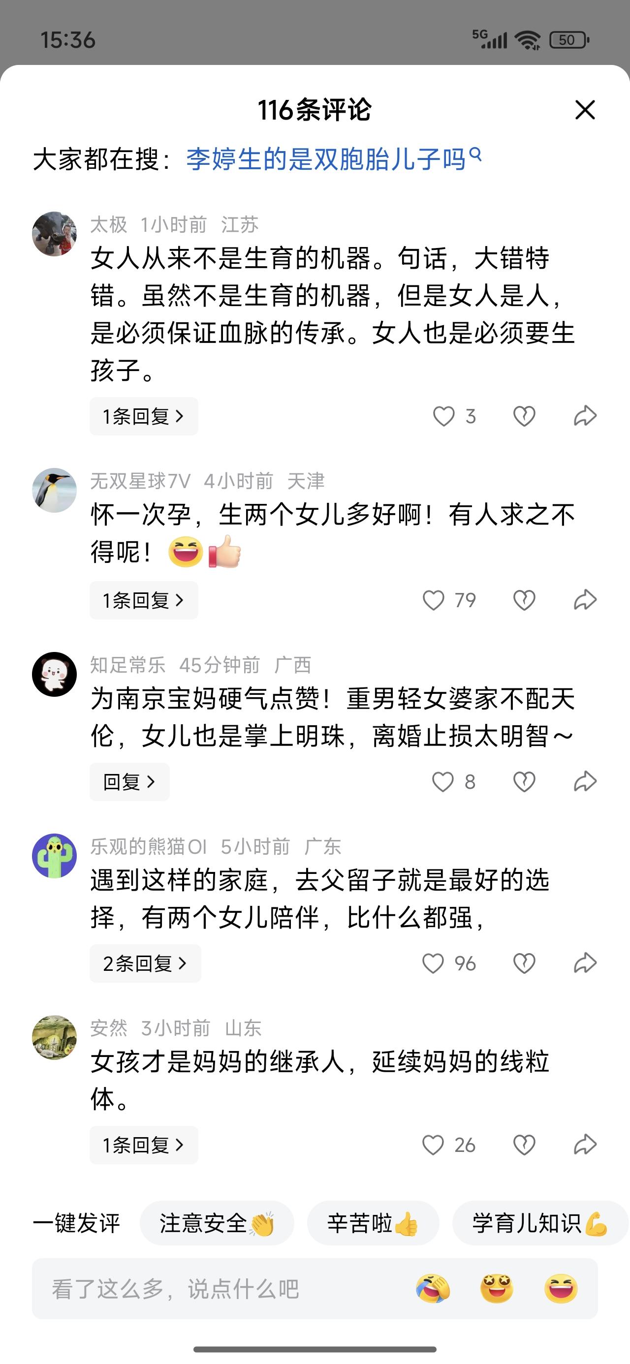 南京宝妈李婷去产检,得知是两个女娃。婆婆当场翻脸,说他家绝后了。要她打掉。李婷没听她的。 搬回娘家,生孩子自己签字。这期间那男的死了么?生完孩子想见孩子了?他妈发疯的时候她去哪了? 离婚痛快走人。去父留子有两个女儿,多么美丽的生活。 要儿子要儿子,王位搁哪儿呢?有家蛋糕店还是有家木工坊呢?不知天高地厚,认不清死活口的,