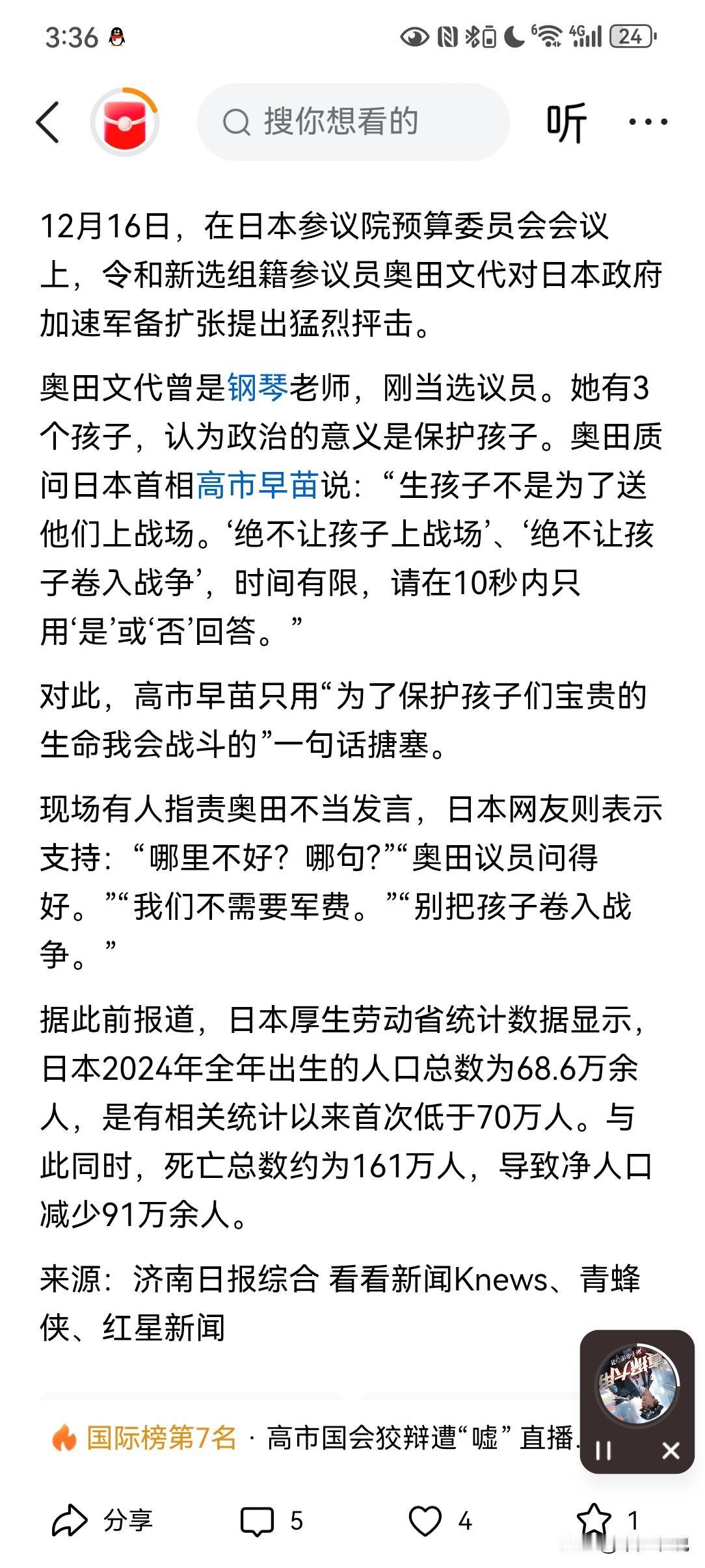 “生孩子不是为了送孩子上战场”日本议员狂怼高市早苗 日本议员高田代文昨天在日本参议院预算委员会会议上以“生孩子不是为了送他们上战场,“绝不让孩子上战场”、“绝不让孩子卷入战争””来狂怼高市早苗。而高市早苗对此回应则非常模糊。 高市早苗复活军国主义的行为就是想拉日本平民一起陪葬,日本国民的觉醒就是在与军国主义复活对抗。