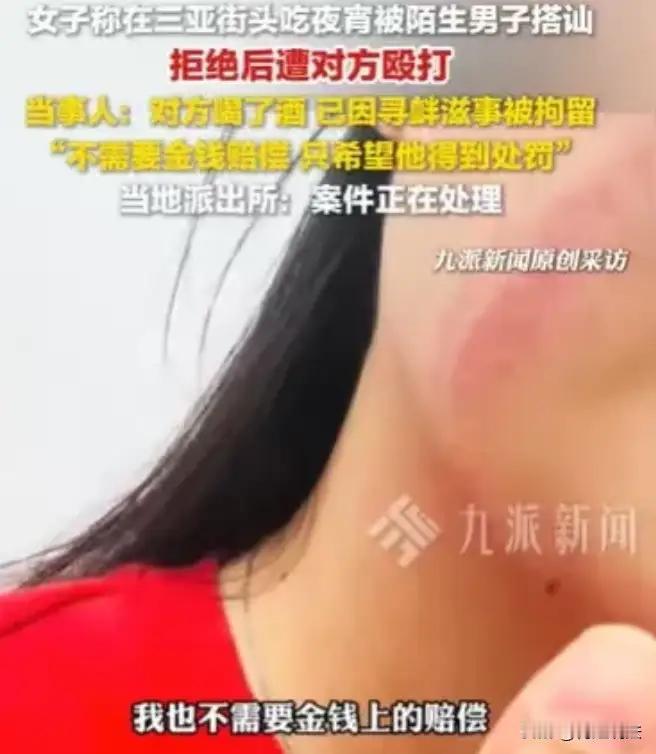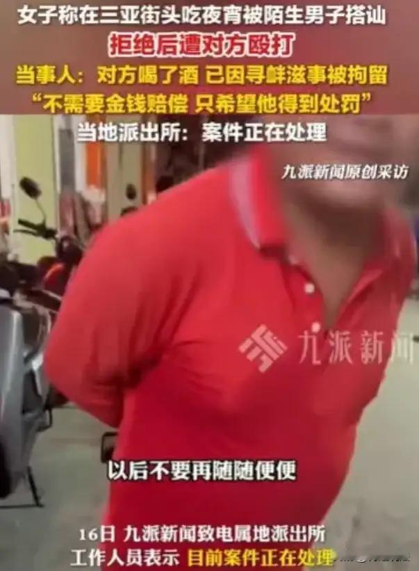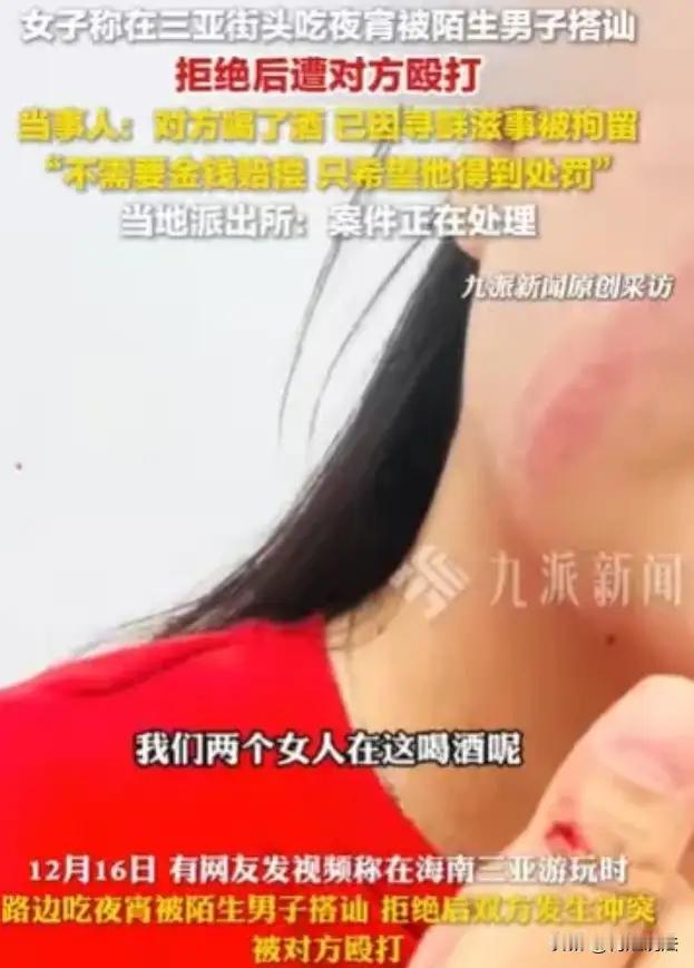 三亚的夜晚本该是美好放松的时光,却因为一个醉酒男子的无理骚扰,演变成了惊心动魄的噩梦。张女士和朋友们正自在地享受街边夜宵时,那名满身酒气的男子骑着电动车突然停下,不请自来,径直坐到她们身边,提出可怕的请求——陪酒。这种赤裸裸的骚扰遭到拒绝后,男子的脸色陡然变得狰狞,语言辱骂、动手动脚,甚至拳脚相加,张女士一时之间成了受害者,身上多处软组织受伤。 令人钦佩的是,张女士展现了强大的勇气和理智——她不追求赔偿,只希望那个男子为他的暴行承担应有的法律责任。正义需要的,正是这样的决心和声音。 这起事件不仅让人愤慨,更引发了公众对于公共安全和女性保护的广泛关注。为何某些醉酒后失控的男子,能够在夜色中肆意侵扰女性?社会安全网的漏洞究竟在哪里?街头的灯光明亮了吗?执法力量的存在感是否足够? 每个人都渴望安全和尊重,特别是在夜晚的街头,那是人们放松身心的时间。然而,现实却依旧残酷:骚扰和暴力屡禁不止,受害者孤立无援。这背后,是社会对女性安全保障的忽视,是公共空间管理的不足。张女士的勇敢发声,不仅仅是为自己讨公道,也为所有处于类似风险中的女性呼喊。 这是一面镜子,映照出我们所有人需要共同努力的方向:从加强公共场所安全管理、提升法律惩戒力度,到营造尊重和谐的社会氛围,每一步都不可缺席。 殴打事件 三亚伤人