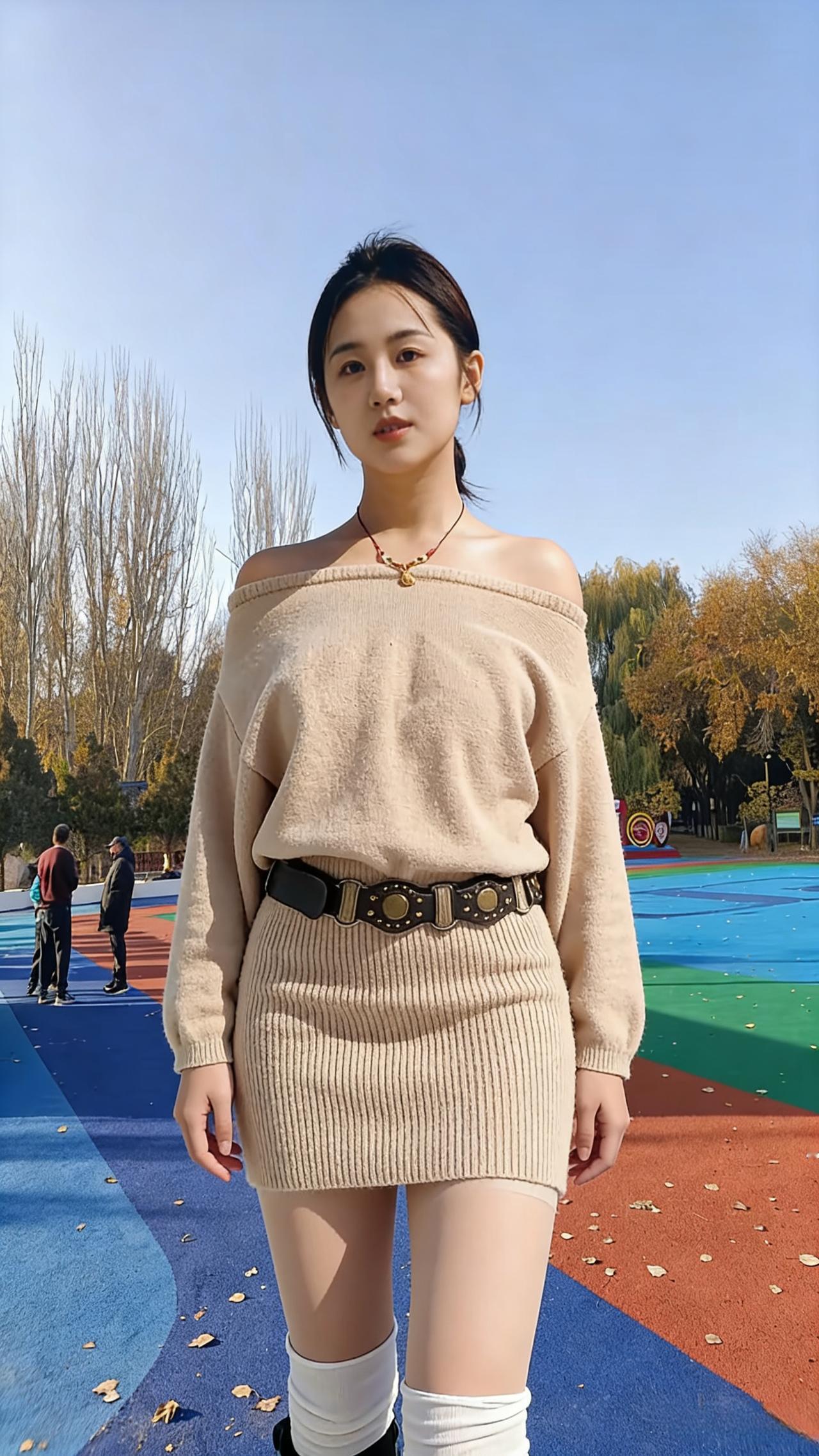 露肩的设计撕开保守 针织的纹理裹着肉身 腰带是自我的界碑 圈定属于自己的领地 ~ 彩色的地面是世俗的画布 她站成不规则的色块 不迎合秋的萧瑟 只以肉身的鲜活 对抗季节的冰冷 每一寸裸露的肌肤 都是对自我的认领