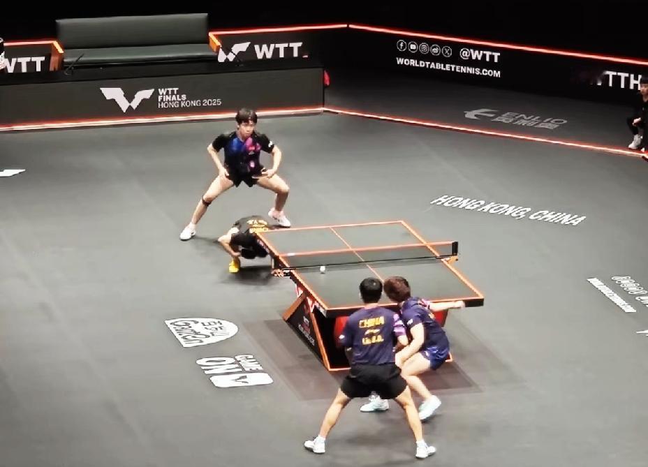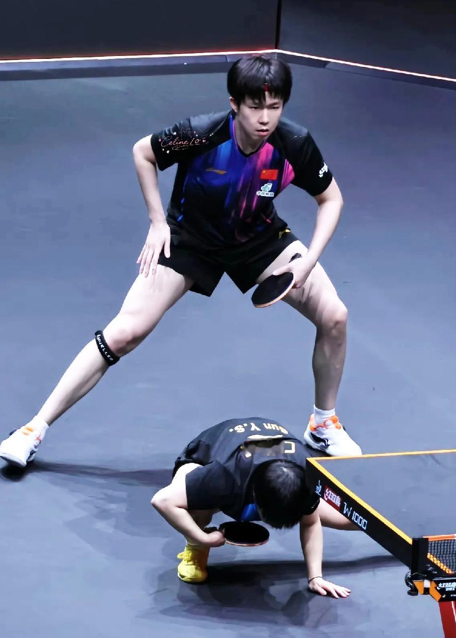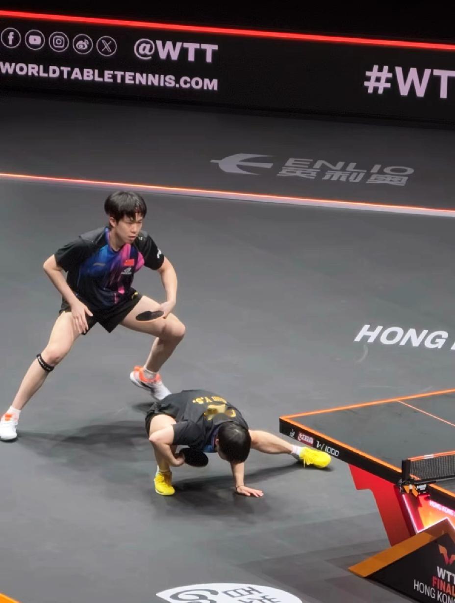 快被莎莎这个动作萌死了, 360度无死角的萌, 看不够根本看不够。 这是香港总决赛, 莎头组合对战动漫组合。 莎莎为了躲球, 自己把球打过去, 赶紧趴下让王楚钦接球。 结果动漫的球没有打过来了, 被网拦住了。 当时我就在想, 莎莎蹲得速度好快, 可惜她白躲了, 球根本没过来。 要不说八年的默契程度, 就是这么得熟练, 她知道他能接住, 他知道她能躲开。 怪就怪这个球“不懂事”, 怪也怪球网“不懂事”, 愣是提前给“截胡”了。 虽然这个球没有过来, 但是让我们看到了可爱的一幕, 真是360度无死角的萌。 网友调侃, “大头,我藏好了。 小豆包,对面没打过来…” (图片源自于网络)