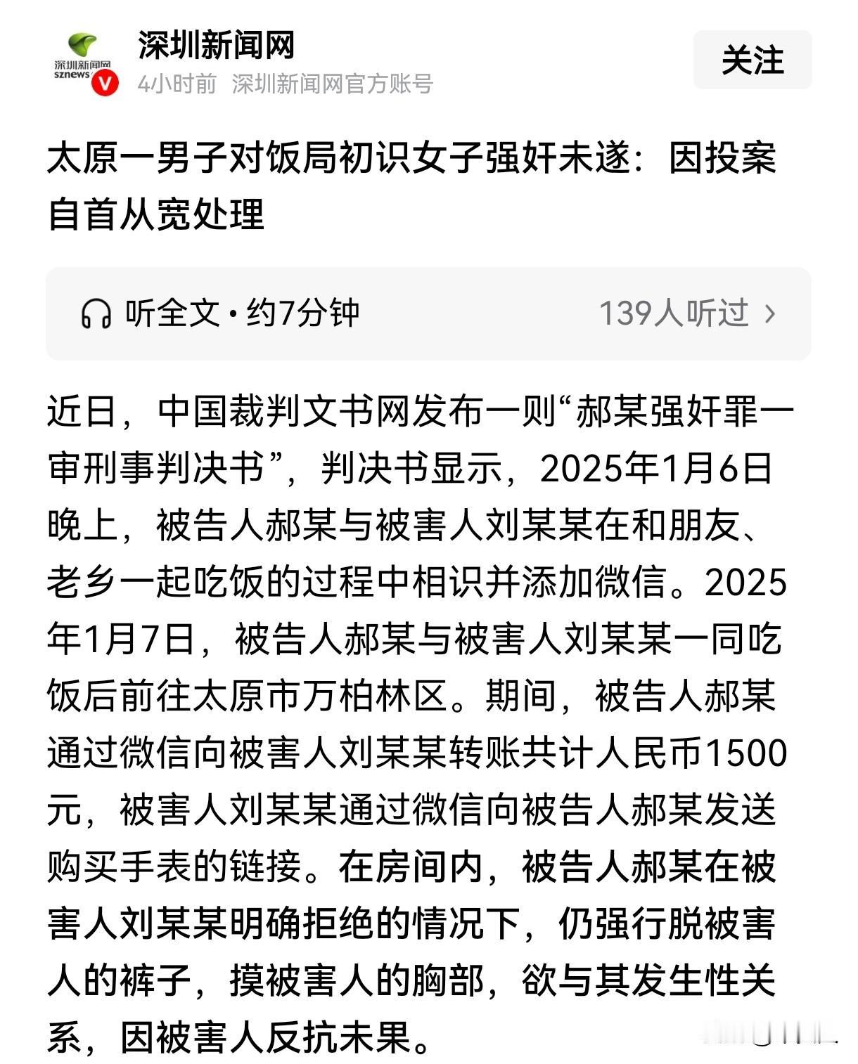 山西太原,男子在朋友饭局上认识了一女子,两人相聊甚欢,加了好友。次日男子带女子出去吃饭,给女子转了1500元,女子收了钱,还让男子给她买礼物,之后,两人一起前往酒店,男子说想跟女子发生关系,女子明确拒绝,可男子还是强行脱下女子裤子,欲霸王硬上弓,女子奋力反抗,男子怕出事才停了手,事后女子报了警,男子因强奸罪被提起公诉,结果让男子欲哭无泪。 2025年1月6日,郝某接到朋友的邀约,说晚上一起聚聚,吃个饭热闹热闹,到时候还有新朋友过来,郝某欣然应允。 在饭局上,经过双方朋友和老乡的介绍,郝某认识了女子刘某,刘某笑容甜美,很是亲切。 两人简单聊了几句,便打开了话匣子,越聊越投机,仿佛有说不完的话题,郝某心里乐开了花,觉得这就是缘分。 饭局结束后,两人加了微信。 次日,郝某脑海里全是刘某,他按捺不住内心的冲动,给刘某发了信息,约她一起出去吃饭,并一块出去玩。 刘某爽快答应,郝某很是兴奋,双方见面后,一起去吃了饭,饭后郝某提出带刘某一起出去走走。 在游玩的过程中,郝某给刘某转了1500元,让她买点自己喜欢的东西。 刘某收了钱,她看郝某这么大方,给郝某发了一个手表的链接,说自己喜欢这款表很久了,就是价格有点贵,自己一直没舍得买。 郝某心领神会,对方这是把自己当成了冤大头,让自己给她买礼物。 天色渐晚,郝某提议去酒店休息,刘某想着自己还要等其他朋友,就跟郝某一起过去了。 进了酒店房间,灯光暧昧,郝某再也控制不住自己,表示想要跟刘某发生关系。 刘某被郝某的举动吓坏了,她并没有想要跟刘某发生点什么,跟他进酒店房间,也只是为了等其他朋友过来接她,她明确拒绝了郝某的要求。 郝某被欲望冲昏了头脑,他觉得刘某既然收了自己的红包和礼物,还跟自己来酒店,就是默认了可以发生点什么的。 他不顾刘某的反对,强行脱下刘某的裤子,还触摸刘某的胸部。 刘某惊恐万分,她大声喊叫,奋力反抗,双手不停挥舞,试图推开郝某。 郝某被刘某的反抗弄得有些不知所措,他看着刘某被吓坏了的样子,心里一阵后怕,担心把事情闹大,会给自己惹上麻烦,他冷静下来,停止了动作,整理好衣服后,离开了房间。 随后刘某报了警,郝某接到派出所电话通知后,主动到案,如实供述了自己的犯罪行为。 但是他认为刘某向自己索要礼物,收了自己的红包,并跟自己一起去酒店,大家都是成年人,她应该知道自己的目的,自己是冲动了,但是在这件事情中,刘某也是有责任的。 刘某却认为自己是收了郝某的红包,自己只是想跟他好好相处,并没有别的意思,去酒店也只是为了跟郝某聊会天,并等其他朋友过来。 她已经很刘某明确说了不想发生关系,可郝某不顾自己的意愿,欲强行跟自己发生关系,还弄伤了自己。 事发后,郝某因强奸罪被提起公诉,法院会如何审理判决呢? 《刑法》第236条规定:以暴力、胁迫或者其他手段强奸妇女的,处三年以上十年以下有期徒刑。 法院审理后认为,根据多方证据来看,刘某跟郝某进入酒店,是为了等待其他朋友过来。 郝某提出发生关系后,刘某明确表示了拒绝,可郝某不顾她的反对,欲强行与刘某发生性关系,因意志以外的原因未得逞,其行为已经构成了强奸罪(未遂)。 《刑法》第23条规定:已经着手实行犯罪,由于犯罪分子意志以外的原因而未得逞的,是犯罪未遂。对于未遂犯,可以比照既遂犯从轻或者减轻处罚。 郝某已经实行了犯罪行为,因刘某反抗并未得逞,他到案后,如实供述罪行,系自首,并且认罪认罚,可以对他从轻处罚。 最终,法院判决郝某犯强奸罪(未遂),判处其有期徒刑1年3个月。 有人说男方跟女方吃了顿饭,就想占人便宜,两人都没有感情,别人怎么可能会答应他这么无理的要求呢。 也有人说既然女方对男方没有意思,为什么认识第二天,就收人家1500元,还发手表链接给人家,男方肯定是误解了,跟人玩暧昧,结果害人害己了。 这场原本美好的相遇,因郝某的冲动和错误理解,变成了一场噩梦。 在人际交往中,不要随便跟刚认识的人出去,因为你不知道对方的真实目的和意图,也不要随意收受他人的财物,以免让别人误解。 男女交往,不要玩弄他人感情,不要玩暧昧,尊重他人意愿,坚守道德和法律的底线。 关注@木头人 ,从法律角度看世界,感受不一样的人情冷暖。
