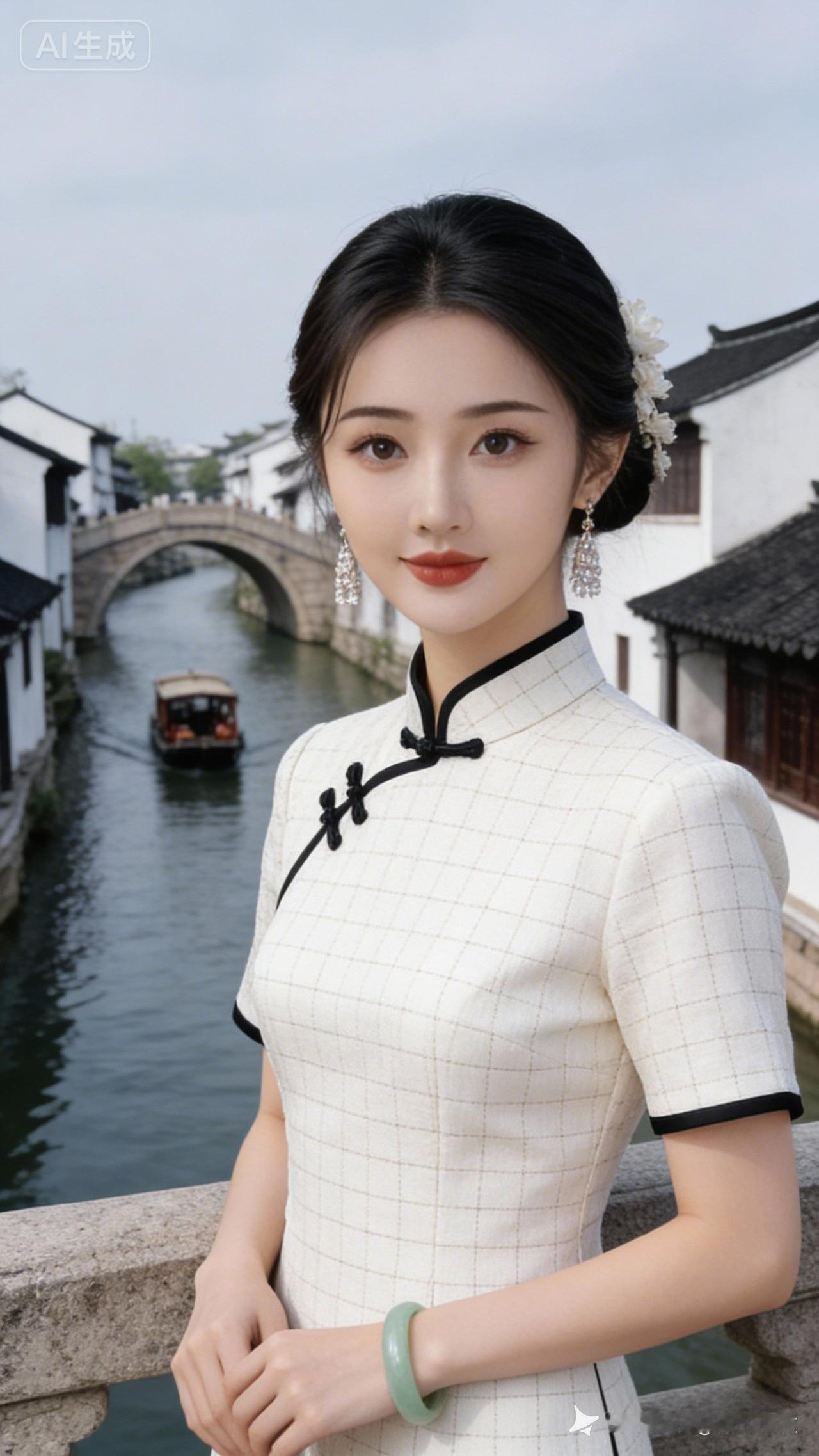 江南水乡的温柔时光,旗袍美人倚桥而立。