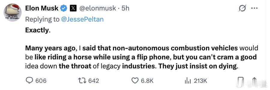 马斯克点评福特电动车战略收缩:非死不可福特汽车收缩了电动车战略,马斯克在回复网友时认为,这标志着传统汽车行业已经无可救药地走向衰落和死亡。“完全正确,几年前我就说过,开不能自动驾驶的内燃机车就像骑马用翻盖手机一样,但是你没办法把好主意硬塞给传统车企,他们就是坚持走向灭亡。”马斯克福特