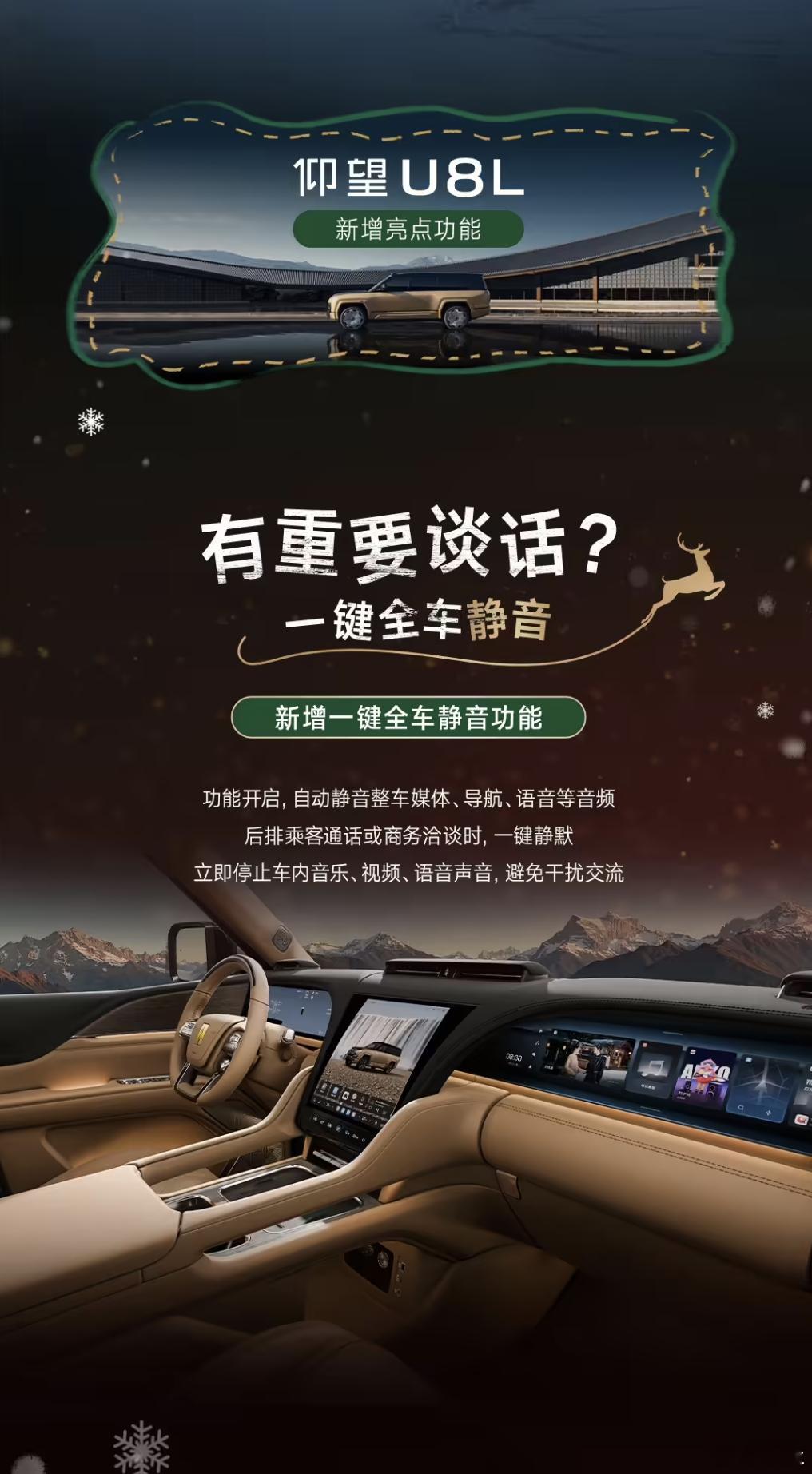 12 月 17 日消息,比亚迪高端品牌仰望汽车正式启动冬季 OTA 升级,此次更新覆盖仰望 U8、U8L 及 U9 多款车型,核心聚焦智能交互、乘坐舒适性与用车安全性,推出包括语音控制防晕车在内的多项实用功能。此次升级以语音控制为核心亮点,大幅提升操作便捷性。仰望 U8 与 U8L 新增语音控制防晕车功能,用户通过语音指令即可触发,系统会联动云辇悬架、香氛系统及车内视觉显示进行多维调节 —— 悬架切换至运动模式扩大调节范围,抑制车身俯仰与侧倾,香氛根据路况自动调整浓度,二排吸顶屏的小白点随行驶状态变化,从体感、嗅觉、视觉多维度缓解晕车不适。比亚迪