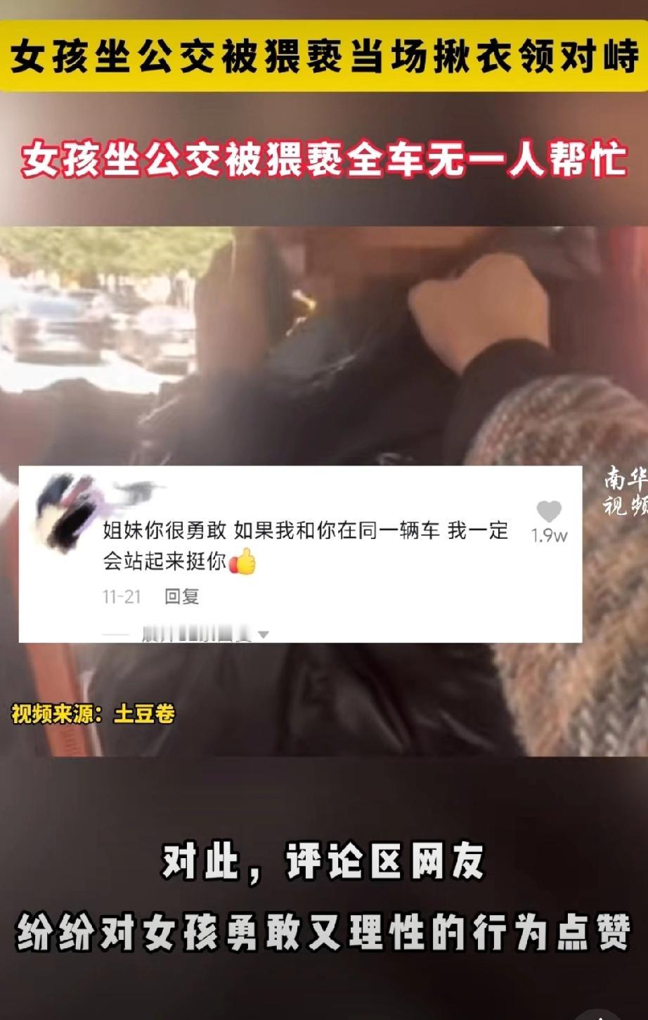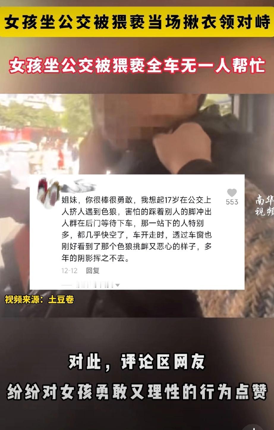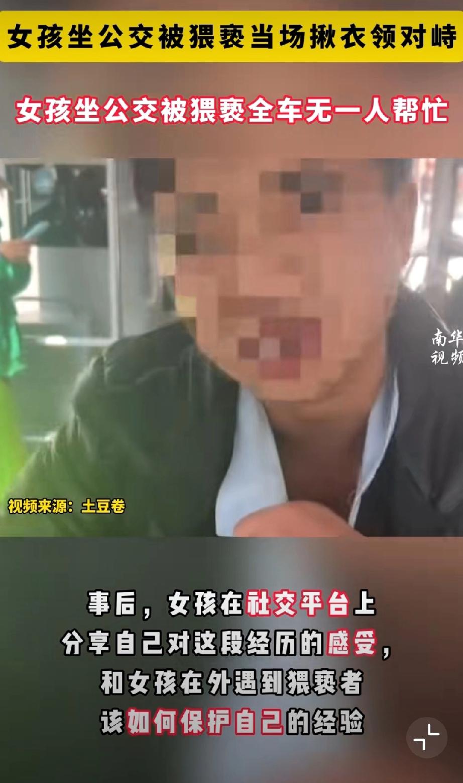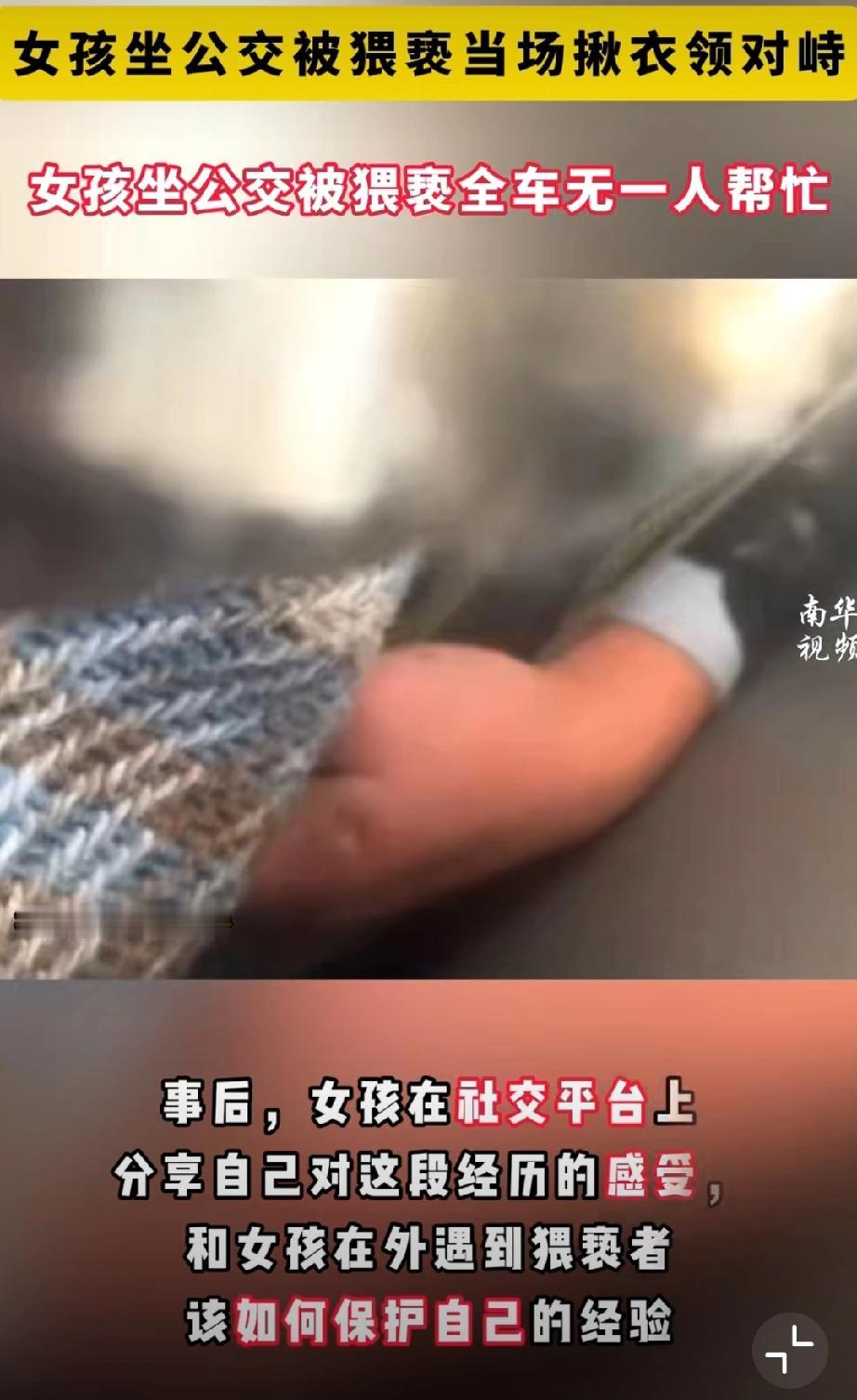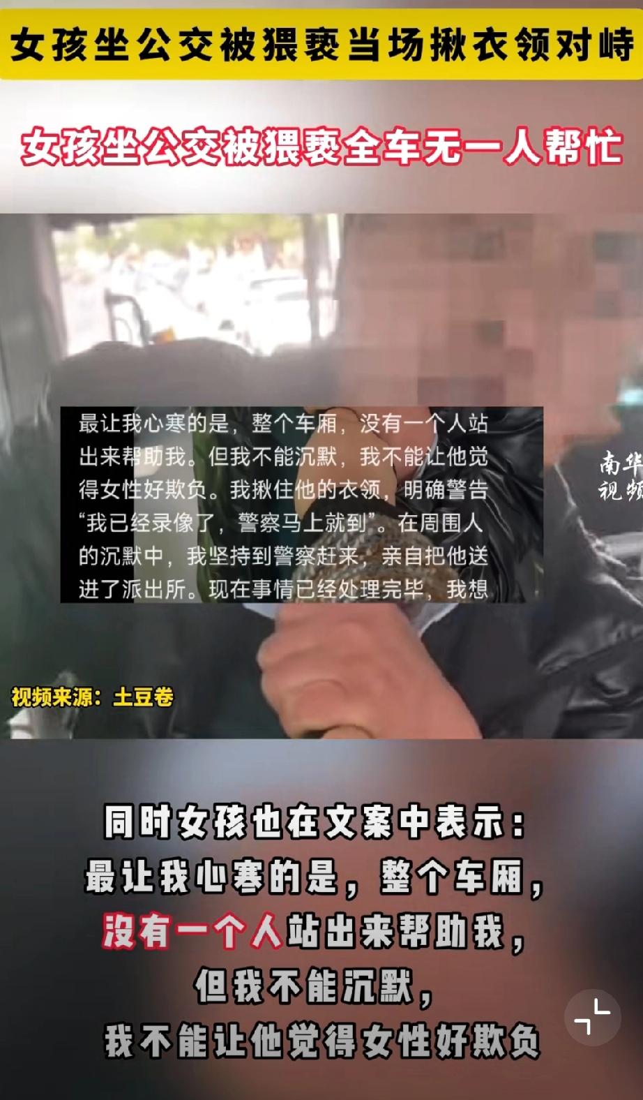 女孩回应坐公交被猥亵无一人帮忙。 近日重庆,一位女孩在公交车上被变态猥亵两次,女孩忍无可忍,在拍视频记录下证据后,揪起对方衣领当场对峙,最后报警将猥亵者送进派出所。事后,女孩发文表示:最让我心寒的是,整个车厢,没有一个人站出来帮助我,但我不能沉默,我不能让他觉得女性好欺负。 每次当我看到见义勇为新闻的时候,我都会为见义勇为者点赞,都会大力支持见义勇为者,因为我们不能让见义勇为心寒!但是,有些人平时可能觉得见义勇为者和自己没关系,懒得去支持这些见义勇为者,你不能只有你自己遇到危险的时候才想起见义勇为者,还有一些人,别人救了她,她却不感恩,让见义勇为者心寒了,自然就没有人愿意见义勇为了。重庆身边事 重庆爆料 地铁男子猥亵