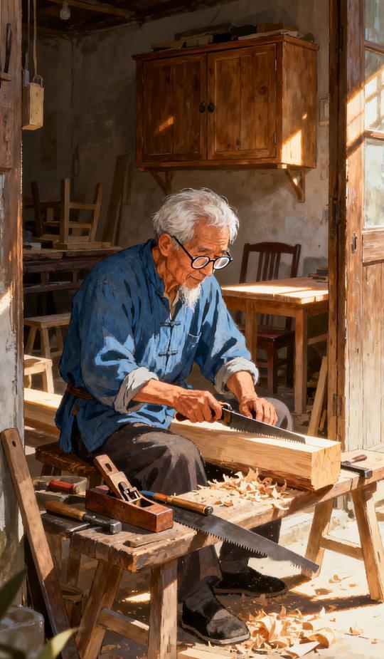 我舍不得删的,是那双眼睛。 早年间,外公的眼睛是锐利的鹰眼。墨线轻轻一弹,笔直的印记便在木料上苏醒,分毫不差。刨花从刨子下翻卷而出,像舒展的浪,空气里满是松木和樟木清冽的香气。那时他的手,是年轻的山脉,关节突出,力量在皮肤下奔流,能稳稳握住沉重的斧凿,也能捏着细砂纸,将一块顽木打磨出绸缎的光泽。他看木头的眼神,是君王在检阅他的疆土,笃定,威严,充满创造的激情。 岁月是另一个技艺高超的匠人,它不用斧凿,却重新塑造了这双手。我照片里的那双手,皮肤薄如陈年的宣纸,包裹着嶙峋的骨节与蜿蜒的青色脉络。那些被无数次木屑嵌入又洗净的纹路,像老树的年轮,深不见底。一道新鲜的伤口横在虎口,渗着细微的血珠,是最后一次尝试时,不听使唤的凿子留给他的纪念。指甲缝里,洗不净的褐色木尘,已成为身体最后的徽章。 可最动人心魄的,是那双手的姿态。它们不再紧握,而是松弛地、略带颤抖地,虚虚地拢着那块未成形的木料。指尖极轻地触碰着木纹的走向,像盲人在阅读盲文,像乐师在调试琴弦。那不是创造者的手,而是告别者的手。他在用触觉,重温一生与木头对话的语言。力量从肌肉中退潮了,但理解与柔情,却在此刻涨至满溢。这双手曾驯服过无数倔强的木材,如今,它正温柔地放走最后一位“未完成”。 我忽然懂得,我们舍不得删的照片,往往与“技艺”或“成就”无关。它截取的,是一个生命与世界最终的和解姿态。那双曾劈削、雕刻、建造的手,在力的尽头,学会了抚摸。外公没有做出那个凳子,但他完成了一件更伟大的作品——他为自己的热爱,举行了一场寂静而庄重的告别式。 照片静静躺在手机里。我舍不得删的,是那双在暮色中,从“驾驭”缓缓渡向“懂得”的手。它让我看见,当生命的力气像潮水般退去,留在沙滩上的,是最温柔的轮廓。