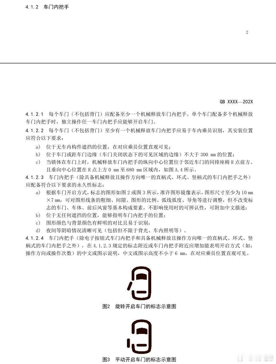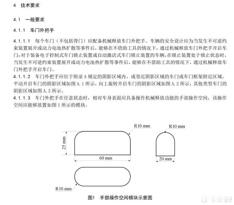 工信部昨天发布《关于公开征求等7项强制性国家标准(报批稿)、强制性国家标准外文版(报批稿)意见的公示》,我们看一下里面有关车门把手的强制性标准意见:关于车门外把手,新的《意见》要求尾门以外的车门应当配备机械释放车门外把手,且在任意状态时均应保持功能完好、能够从外部打开车门;而在车门内把手这块,《意见》则要求尾门以外的车门应当配备至少一个易于识别的机械释放车门内把手,同时还需要附带易于识别的永久性功能标识。新能源汽车汽车资讯