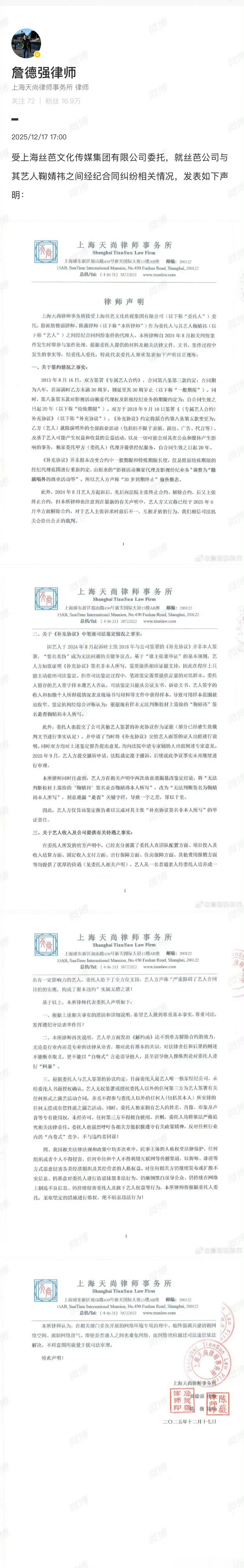 鞠婧祎律师发声明称:丝芭长期伪造艺人签名签双重合同,侵占鞠婧祎演艺收入,字迹鉴定