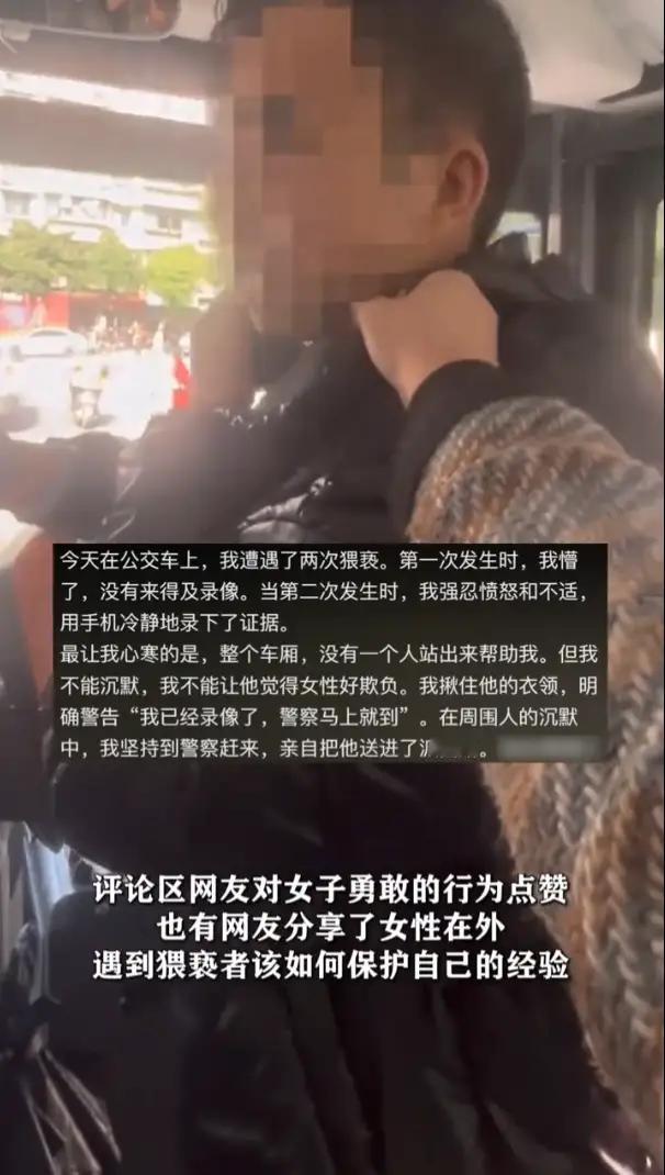 全车人都“麻木”了?女子坐公交遭威胁抓对方衣领,全车无人帮忙。 这起事件反映出了公共场所中公众的冷漠与社会责任感的缺失,也引发了人们对社会安全与道德责任的深刻思考。以下是对此事件的分析和一些可能的建议: 事件回顾: 一名女子在重庆乘坐公交车时,遭遇了一名男子猥亵行为。 初次未能录下证据,女子冷静应对,避免冲突。 男子再次威胁,女子果断用手机录下全过程,并抓住男子衣领,明确表示已报警。 警方介入,男子被带走。 令人心寒的是,车上众多乘客没有一人出手相助或提供帮助。 引发的思考: 公众的冷漠:在事件发生期间,车上的乘客没有任何反应或帮助,体现了某种程度的“麻木”。这种冷漠可能源于对事件的无感、怕惹麻烦或法律意识淡漠。 女性维权的理智与勇气:女子表现出较高的维权意识和理性处理方式,值得肯定。 社会责任感的缺失:作为公共场所的乘客,应当有责任感关注身边的安全,及时伸出援手。 建议与思考方向: 增强公众的安全意识与责任感:通过宣传和教育,提高人们在遇到类似事件时的应对能力和勇气。 完善法律保护机制:加大对性骚扰行为的打击力度,提升受害者的法律保障。 建立举报与援助机制:在公共交通工具上设置紧急报警装置,或由司机、工作人员及时介入。 倡导共同守望相助的社会风尚:鼓励乘客互相协助,形成关爱与保护的社会氛围。 这起事件提醒我们,每个人都应承担起公共责任,不让“麻木”成为社会的常态。只有共同努力,才能营造一个更安全、更有温度的社会环境。