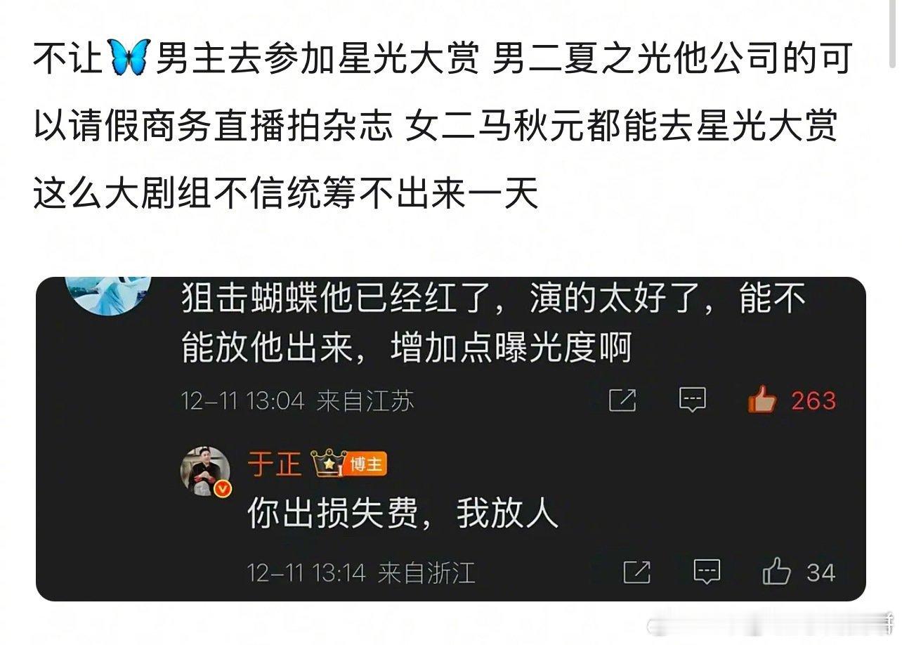 网友让于歪放周柯宇去星光大赏,于歪说“你出损失费,我放人”(所以到底为啥不让去啊?感觉也不是他说的损失费的事情吧