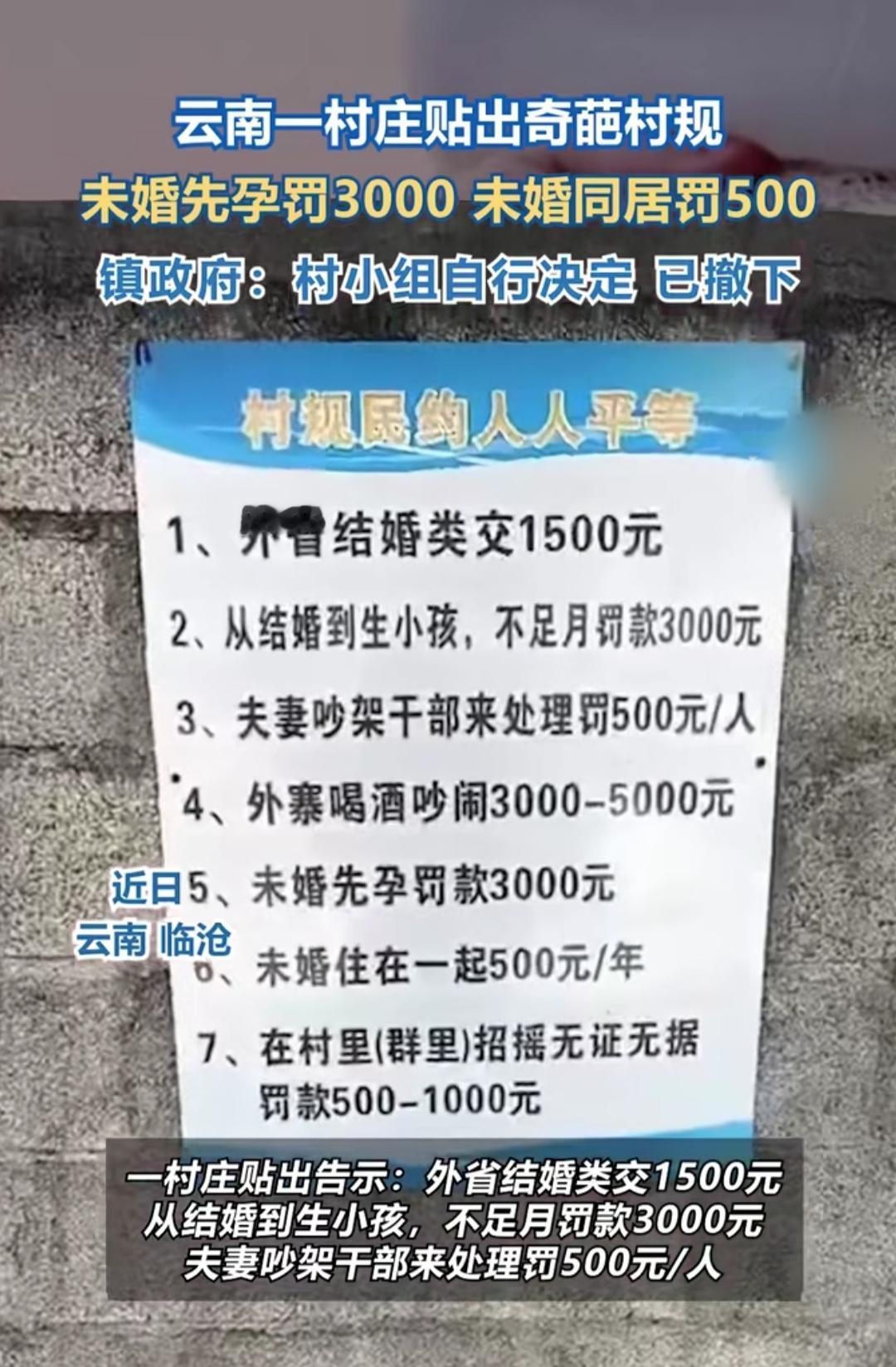 云南临沧某村庄的新规火到让人看不懂!未婚先孕罚3000,和外省人结婚交1500,就连未婚同居每年都要缴500元,这哪是村规,简直像罚款清单! 刷到这则新闻时,不少网友都懵了:现在都2025年了,还能有这种限制个人自由的规定?年轻人谈恋爱结婚本是人生大事,怎么就和“罚款”绑上了?村里或许是想规范风气,但用罚款来约束婚恋选择,也太离谱了。 更关键的是,这些所谓的"村规"根本没有法律效力。婚姻自由、人身自由是受法律保护的,任何组织都不能用罚款等方式干涉。想想那些在外打拼的年轻人,想和心爱的人组建家庭,还要被家乡的“奇葩规定”添堵,心里得多不是滋味。 村规民约的初衷是让村子更好,但前提是合法合规、尊重民意。与其靠罚款"一刀切",不如多倾听村民的想法,用更人性化的方式凝聚人心。你怎么看待这些“奇葩村规”?