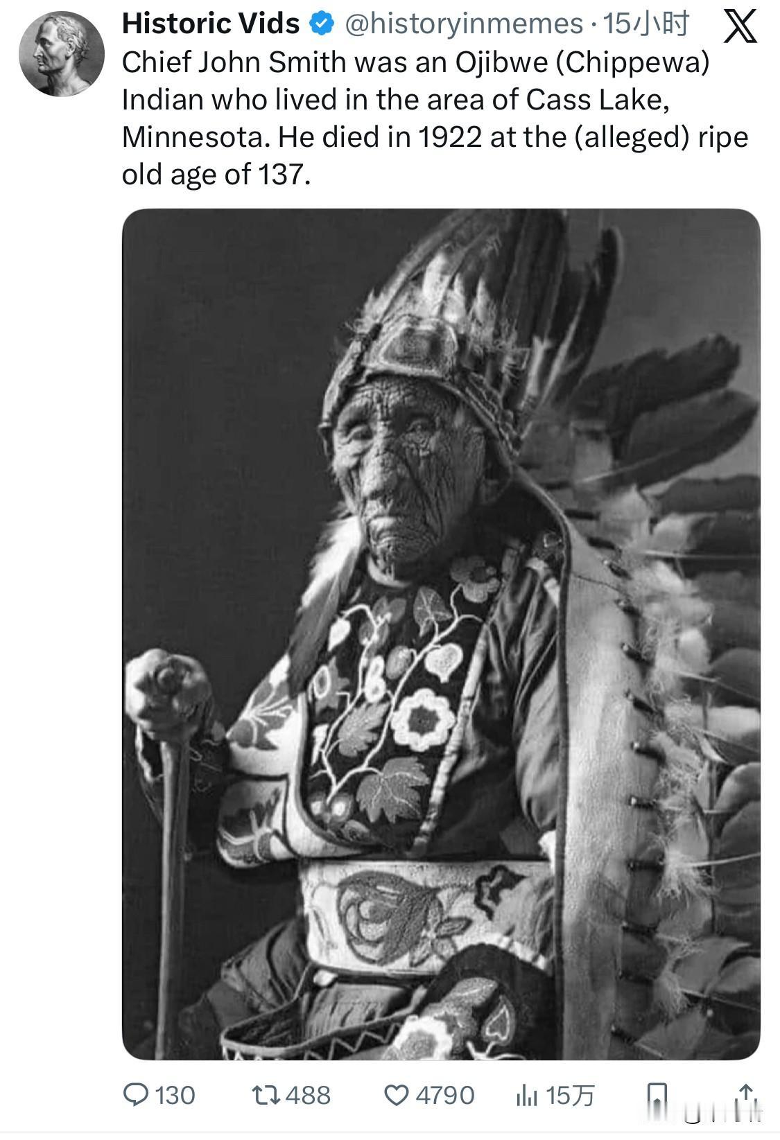 这张照片中的人是约翰·史密斯酋长(Chief John Smith),一位奥吉布瓦(Ojibwe,也称作Chippewa)印第安人领袖。他也被称为“白狼”(White Wolf)或“起皱的肉”(Gaa-binagwiiyaasens 或 Wrinkle-Meat),后者是源自他深邃皱纹的绰号。 关键信息 身份: 约翰·史密斯酋长是明尼苏达州卡斯湖地区的奥吉布瓦(Ojibwe)族人。 年龄争议: 他去世时的确切年龄存在争议。联邦印第安人登记专员曾认为他出生于1822年至1826年之间,但根据他本人的说法,他可能早在1784年就出生了。 去世时间: 他于1922年2月6日去世,享年可能为137岁,被认为是活得最长寿的美国原住民之一。 在他生命的最后几年,他曾作为“高龄美国原住民”的特色人物出现在全美巡回的电影展览中。这张照片是他那个时代众多摄影师记录美国原住民文化努力的一部分。