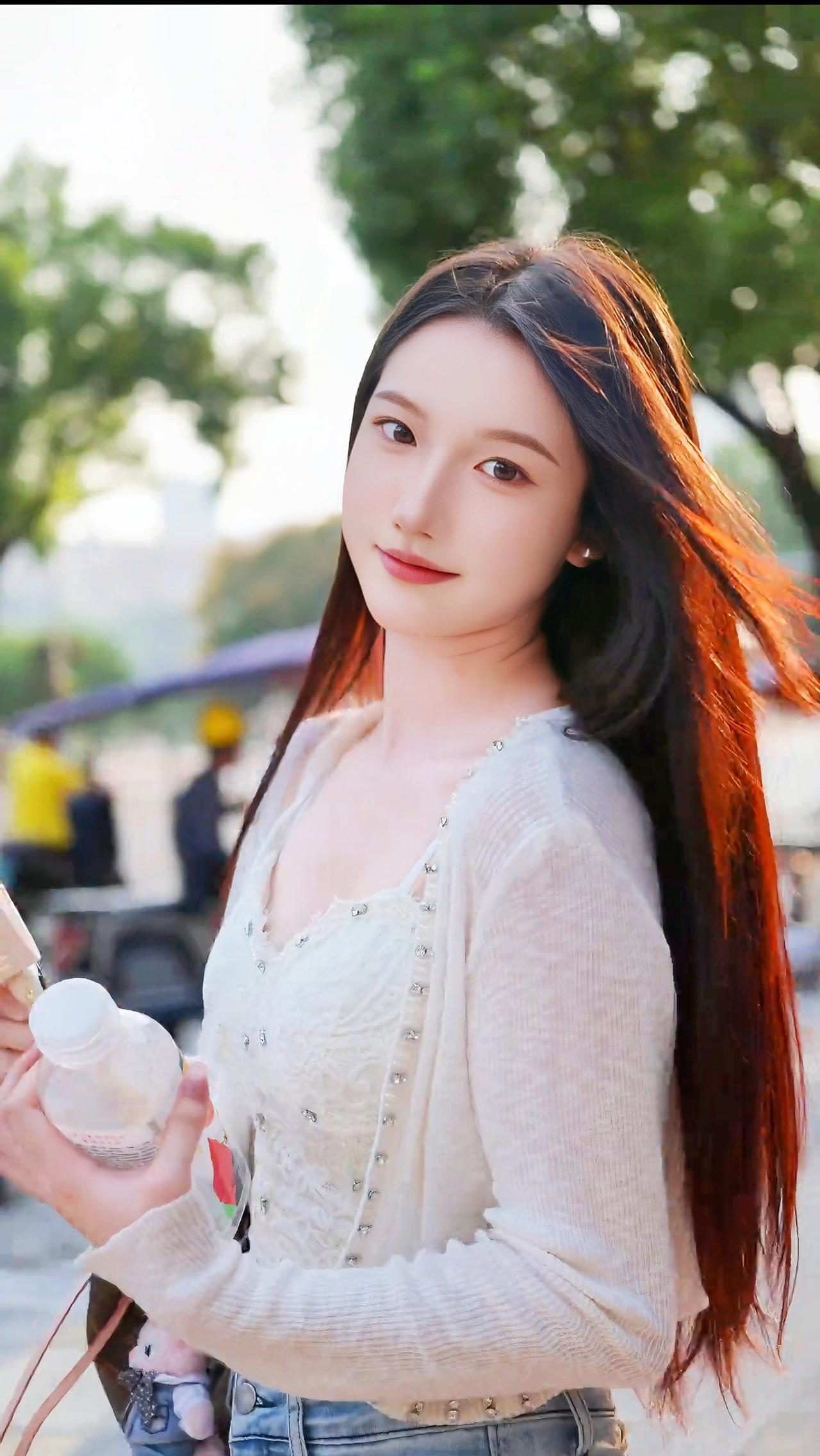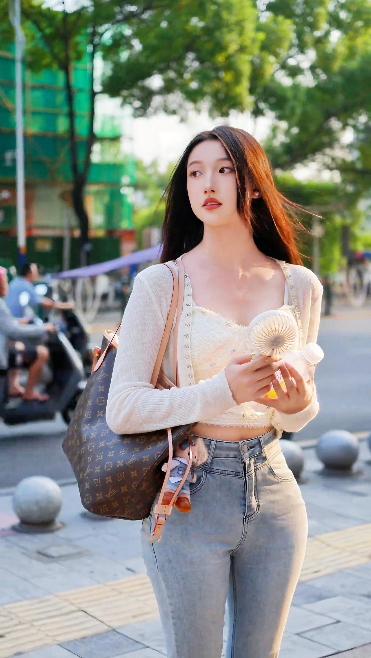 夏日清新穿搭,浅蓝色牛仔裤搭配白色上衣,手拿饮料,轻松自在。