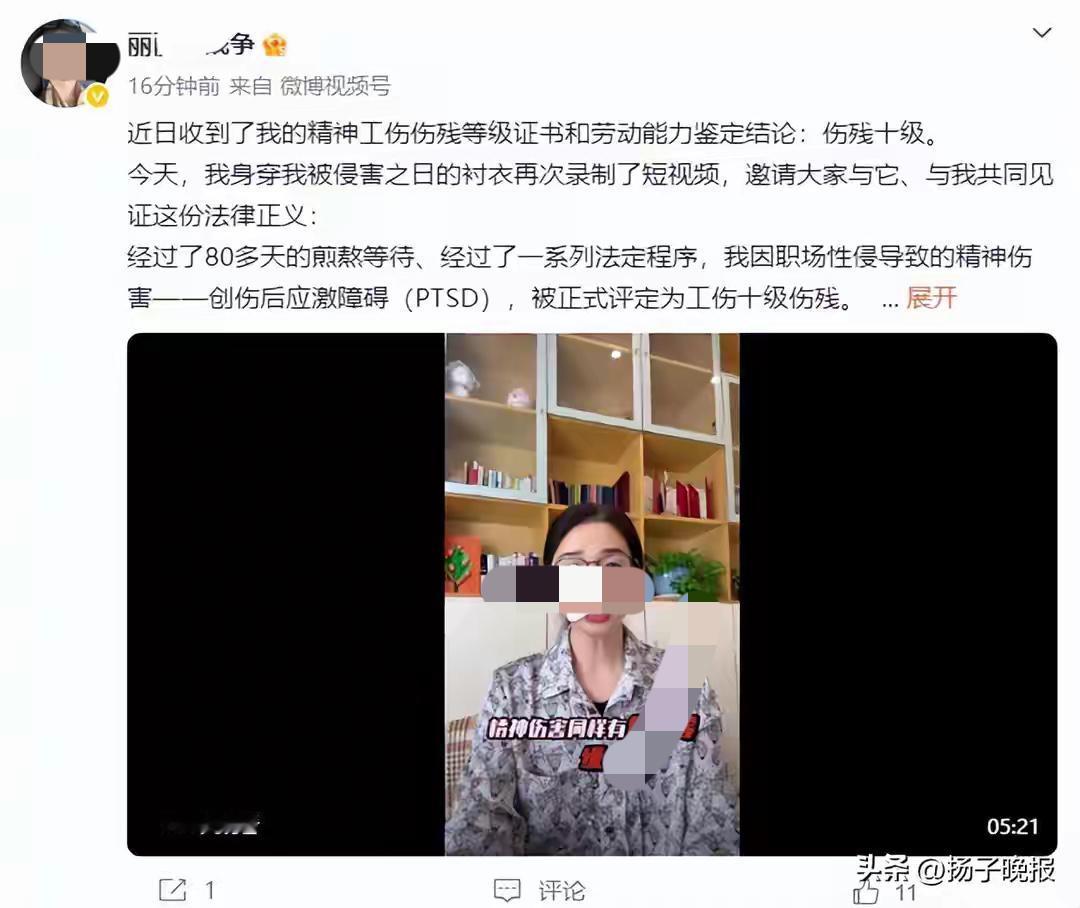 恭喜,恭喜丽丽拿到了工伤十级伤残国家证书。 丽丽发文经过80天的努力,12月1日拿到了国家认定的工商10级商场认定。这背后艰辛和努力努力值得肯定,她是女性朋友的的一缕光。 丽丽特意穿上的那一件被侵犯时的衣服,在网络上广而告之,告诉广大支持她的朋友,她赢了。她也很开心,有结果了。