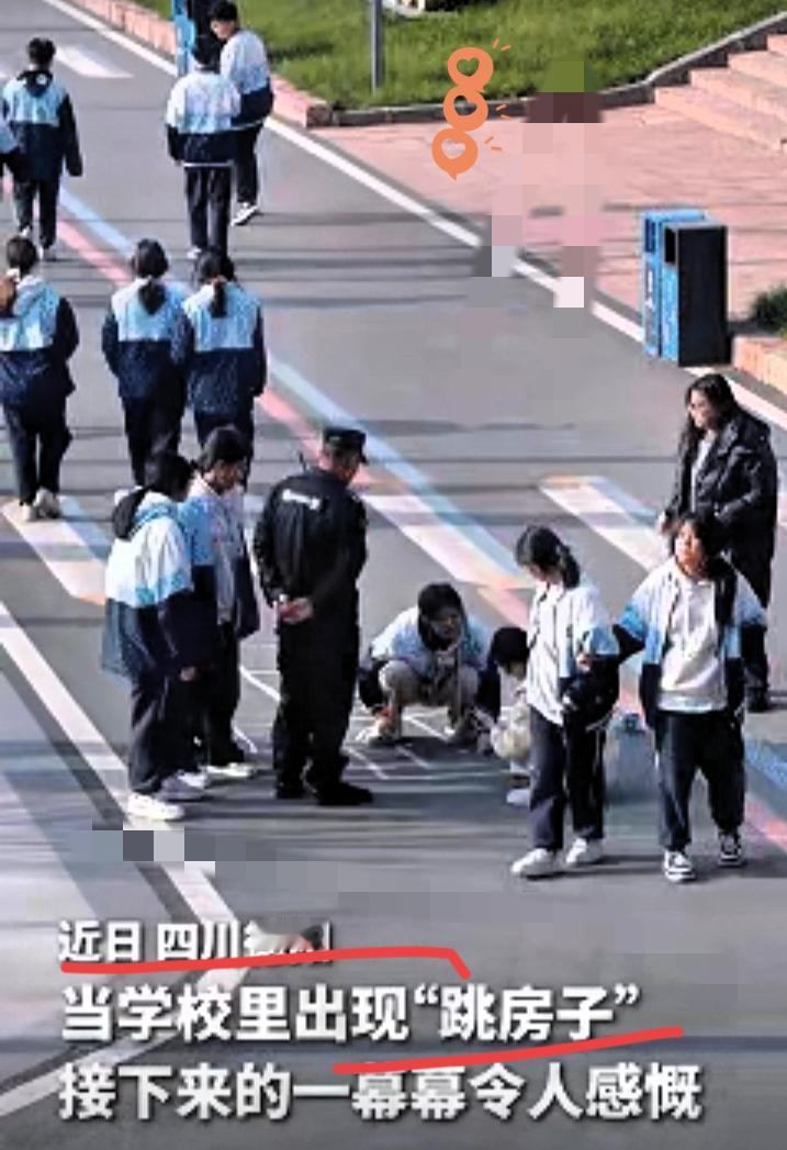 “解释不清了!”四川德阳,两个高中女生趁着课间,在上课的必经路上,用粉笔画了个"跳房子"的游戏,没想到,接下来发生的一幕幕,让人既想笑,又想哭……网友:他们好像跳错了,因为没有跳回去;他们好像又没跳错,因为好像回不去了。 路过的割草工人脚步顿了又顿,最终还是匆匆走开;下课的男生眼睛一亮,单脚双脚切换得行云流水;巡逻的保安四下张望,偷偷跳完还忍不住咧嘴笑;就连老师们也放慢脚步,在格子里一步一步回味旧时光。 这哪是跳房子啊,分明是踩着时光的格子,和小时候的自己撞了个满怀。现在的孩子捧着手机平板,再也体会不到一根粉笔一颗石子就能玩半天的快乐。我们总忙着往前赶路,却忘了那些被遗忘的格子里,藏着最纯粹的童年。 那些年你蹲在地上画过的格子,还记得最后一格跳完许的愿吗?评论区聊聊~