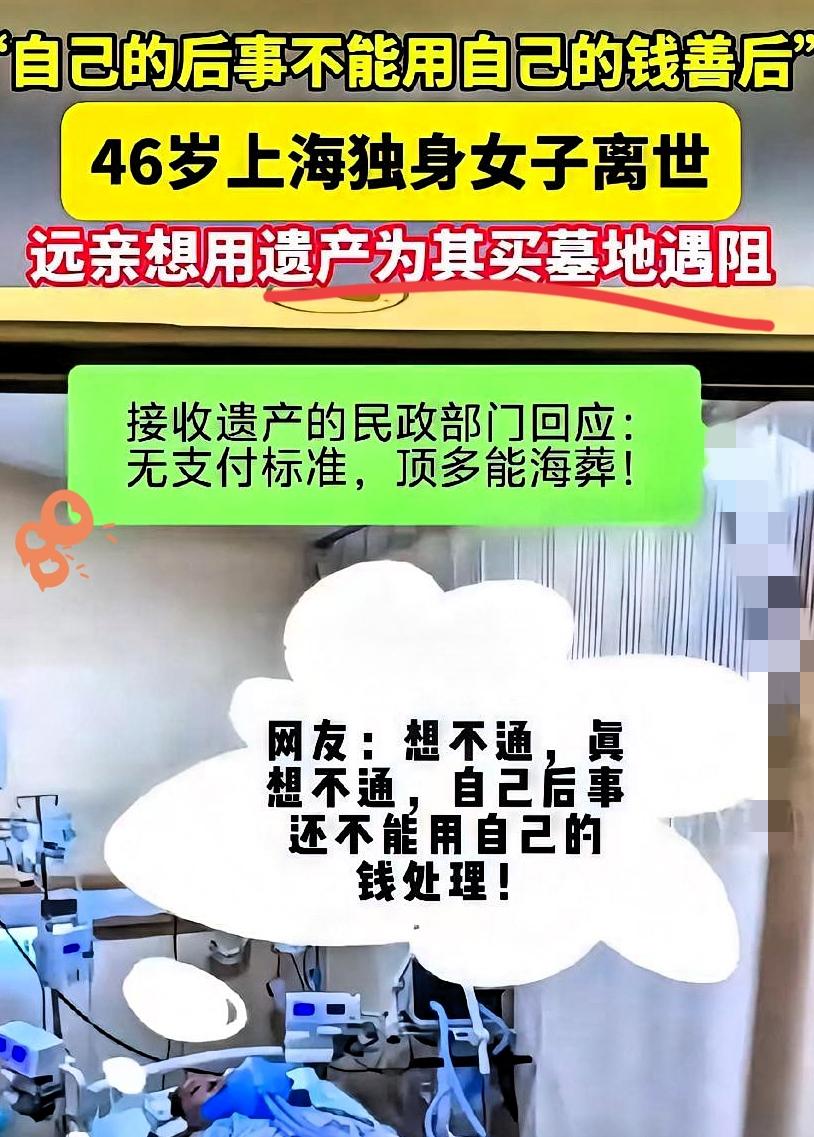 你还敢坚持单身吗? 还能坚定地选择不生孩子吗? 上海虹口46岁的蒋女士, 这事儿你们都听说了吗? 父母早逝、未婚无子、没有近亲属,她因脑溢血离世后,远房亲戚惦记着拿遗产买墓地,却被社区书记直言顶多安排海葬。这事儿看着扎心,却戳破了一个真相:单身或丁克的底气,从来不是一时的潇洒,而是对晚年生活的周全规划。 别拿“养儿防老”绑架人生选择,但也别忽视无依无靠的潜在风险。婚姻和孩子从来不是必选项,可提前做好保障、攒够底气,才是对自己负责。 你觉得单身或丁克族,该提前做好哪些准备?评论区聊聊~