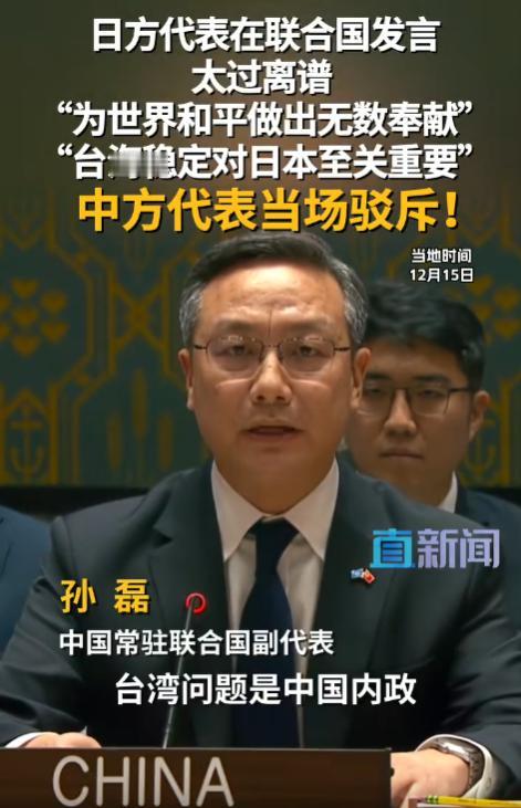 日本人撒谎一点不带脸红!“日本一直是一个奉行爱与和平的国家,为全世界的和平与繁荣作出了无数贡献,台海和平稳定对日本至关重要,也是为了整个国际社会的稳定。”12月15日,日本常驻联合国代表山崎和之在联合国公然撒谎,中国代表完全不惯着他,当场怒怼! 中国代表孙磊当场回击,明确台湾问题是中国内政,绝不允许外部势力插手!双方就涉台议题展开激烈交锋。 说起日方的“和平贡献”,纯属颠倒黑白的历史虚无论调。 作为二战侵略国,日本从未彻底清算战争罪责,右翼势力年年参拜供奉甲级战犯的靖国神社,还在教材中篡改侵略历史,试图让后代遗忘罪行。 嘴上喊着和平,行动上却不断突破军事限制,2025年防卫预算飙升至11万亿日元,早早完成扩军目标,解禁集体自卫权后,自卫队海外活动越来越频繁,这样的行径哪里沾得上和平的边。 台海问题的本质再清楚不过,《开罗宣言》《波茨坦公告》早把台湾划归中国领土,联大2758号决议更是从法律上确认这一事实,《中日联合声明》也明确日方要尊重中国主权。 日本拿“台海稳定”说事,根本不是真关心地区安全,而是想借涉台议题制造紧张氛围,为自己扩军备战、谋求地区霸权找借口。 这种违背国际法和双边协议的操作,就是赤裸裸的干涉内政。 日本作为战败国,本该恪守和平承诺,却一步步走向军事扩张,继续在台湾问题上玩火,只会破坏中日关系根基,给地区和平带来风险。 忘记历史就意味着背叛,无视法理终将自食恶果,这是国际社会公认的铁律。 【评论区聊聊】日本频频炒作涉台议题,背后真实目的还有哪些? (信源:中方代表驳斥日方离谱言论 当地时间12月15日下午,在联合国安理会“为和平展现领导力”公开辩论会上,面对日本代表的连番狡辩,中国常驻联合国副代表孙磊大使两次予以严词驳斥!——直新闻)