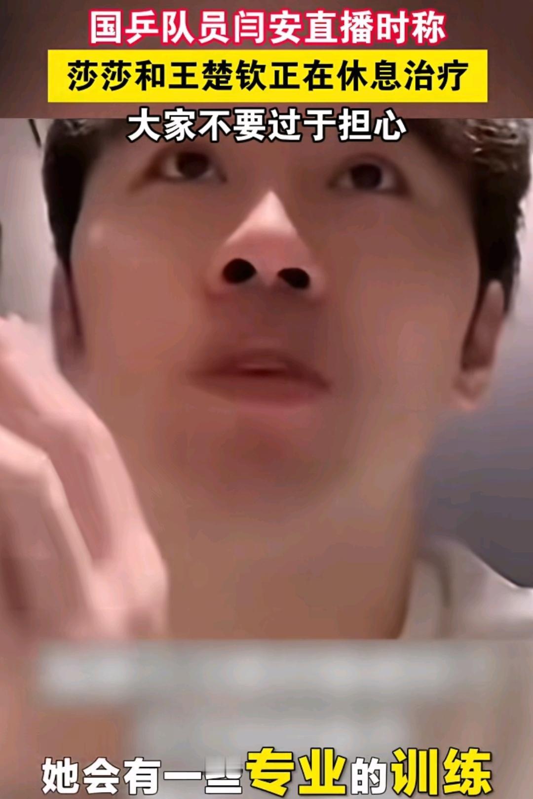 闫安在直播间透露,莎莎休息治疗期间,不同于大家想象的伤筋动骨后的纯躺着休息,莎莎和楚钦会是一边休息治疗,还有一些同步的功能性训练,会有一些专业的辅助训练,来帮助和增强或者说帮助他们更快地恢复。 孙颖莎和王楚钦先后因伤退赛香港总决赛,让无数球迷心疼担心不已,前国乒运动员闫安及时为大家送来莎莎和楚钦的消息,起码可以让球迷心理上有一个舒缓,期待莎莎和楚钦早日康复归来。 闫安让大家不用过于担心,当大家再次看到莎莎和大头出现在比赛场上的时候,他们俩一定是一个全新的精神面貌,,全新的状态,一定都是非常好的状态。