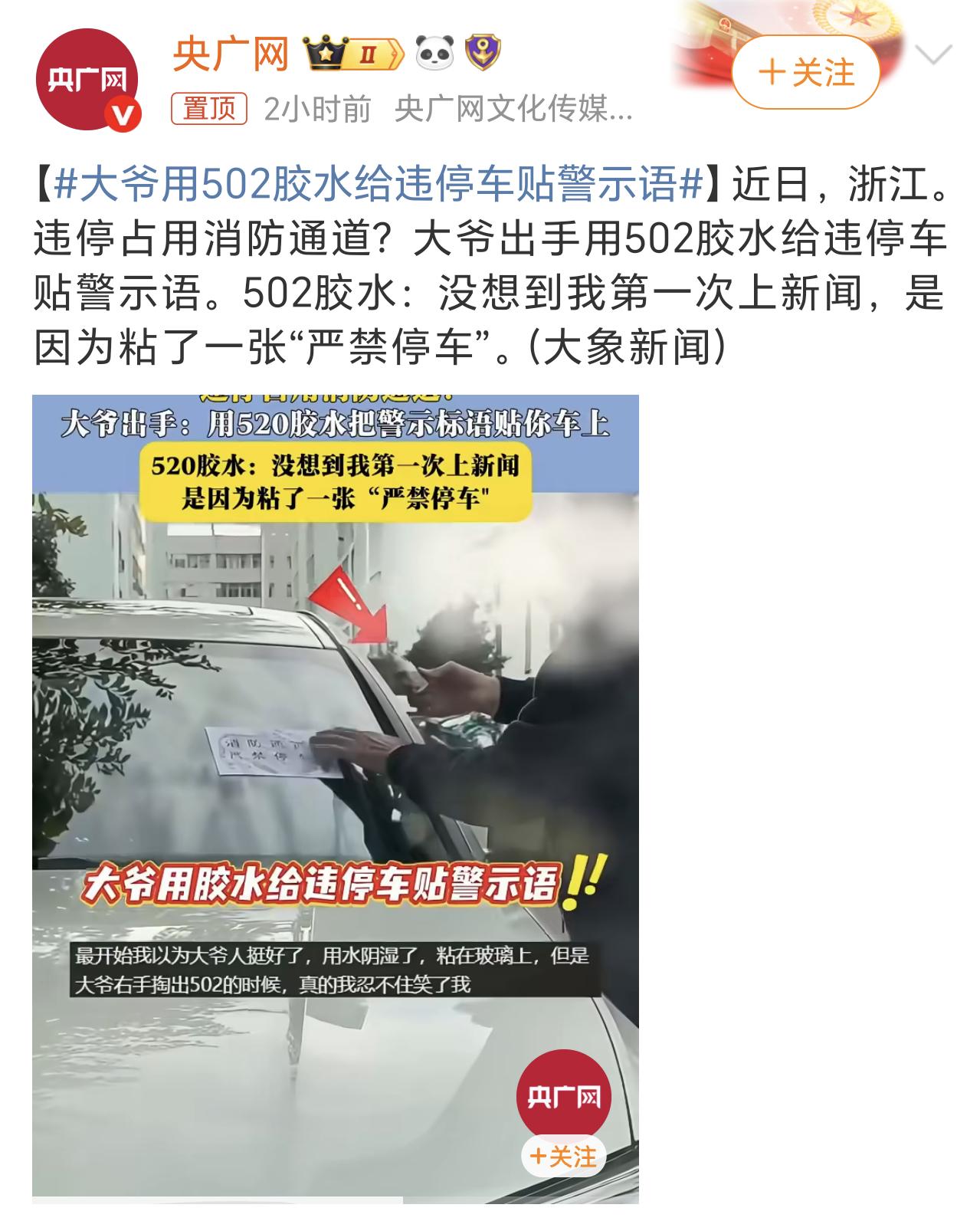 大爷用502胶水给违停车贴警示语大爷还是手下留情了,如果502胶水没有贴玻璃上而是贴在了车漆上,那损失就大了