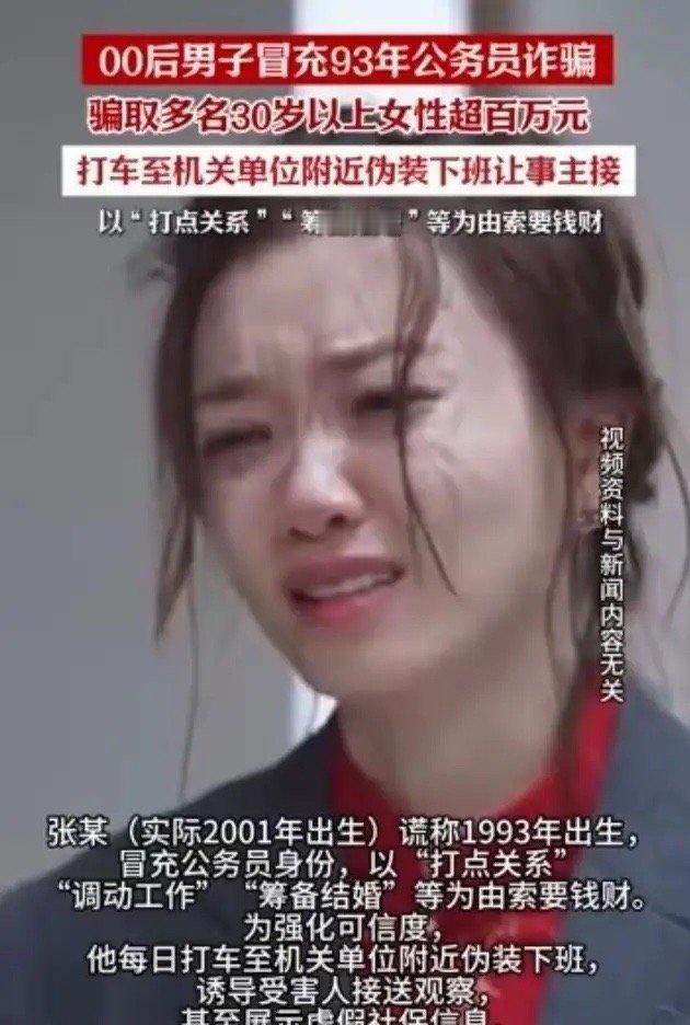 现在的00后真是让人“刮目相看”啊!北京有个24岁的张某,伪装成1993年生人,打车到机关单位附近,还让4名30多岁女子接他下班,就这么冒充公务员骗了100万左右。 这张某体态臃肿但面目青涩,可在女友吴女士眼中却是成熟稳重的公职人员。他虚构花钱打点关系等理由,让吴女士不仅感情受骗,多年积蓄也打了水漂。他用同样手段骗了好几位同年龄段女性。不过,正义不会缺席,他因涉嫌招摇撞骗被刑事拘留。只能说,骗术再高明,也躲不过法律制裁。