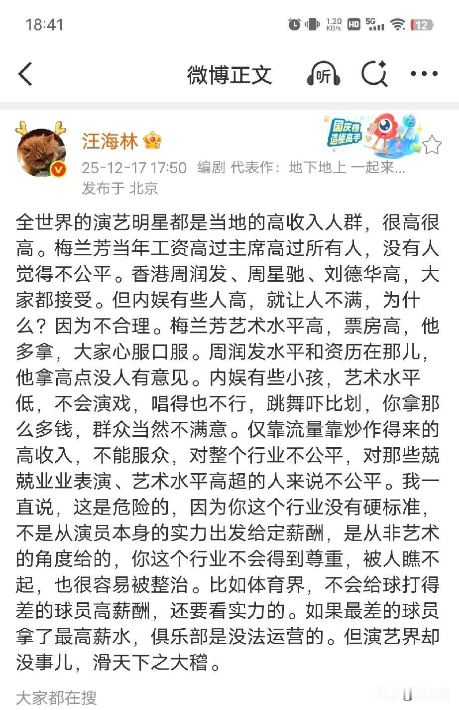 汪海林怒撕娱乐圈:老戏骨赚钱服气,流量明星凭啥天价?汪海林一番话直接捅破了娱乐圈那层窗户纸! 他说,像梅兰芳、周润发那样的前辈,艺术水平顶尖,票房号召力强,人家拿天价报酬,观众心服口服。 可现在呢? 某些年轻艺人,演戏瞪眼,唱歌跑调,跳舞像做广播体操,全凭一张脸和热搜炒作,居然也能拿天价片酬! 这公平吗?这让那些兢兢业业拍戏的老演员情何以堪? 这道理其实特简单:就像你公司里,活儿干得最差、天天摸鱼的人,反而奖金最高,你能服气吗? 一个行业如果没有凭真本事吃饭的硬规矩,只比谁流量大、谁热搜多,这个行业永远得不到真正的尊重。