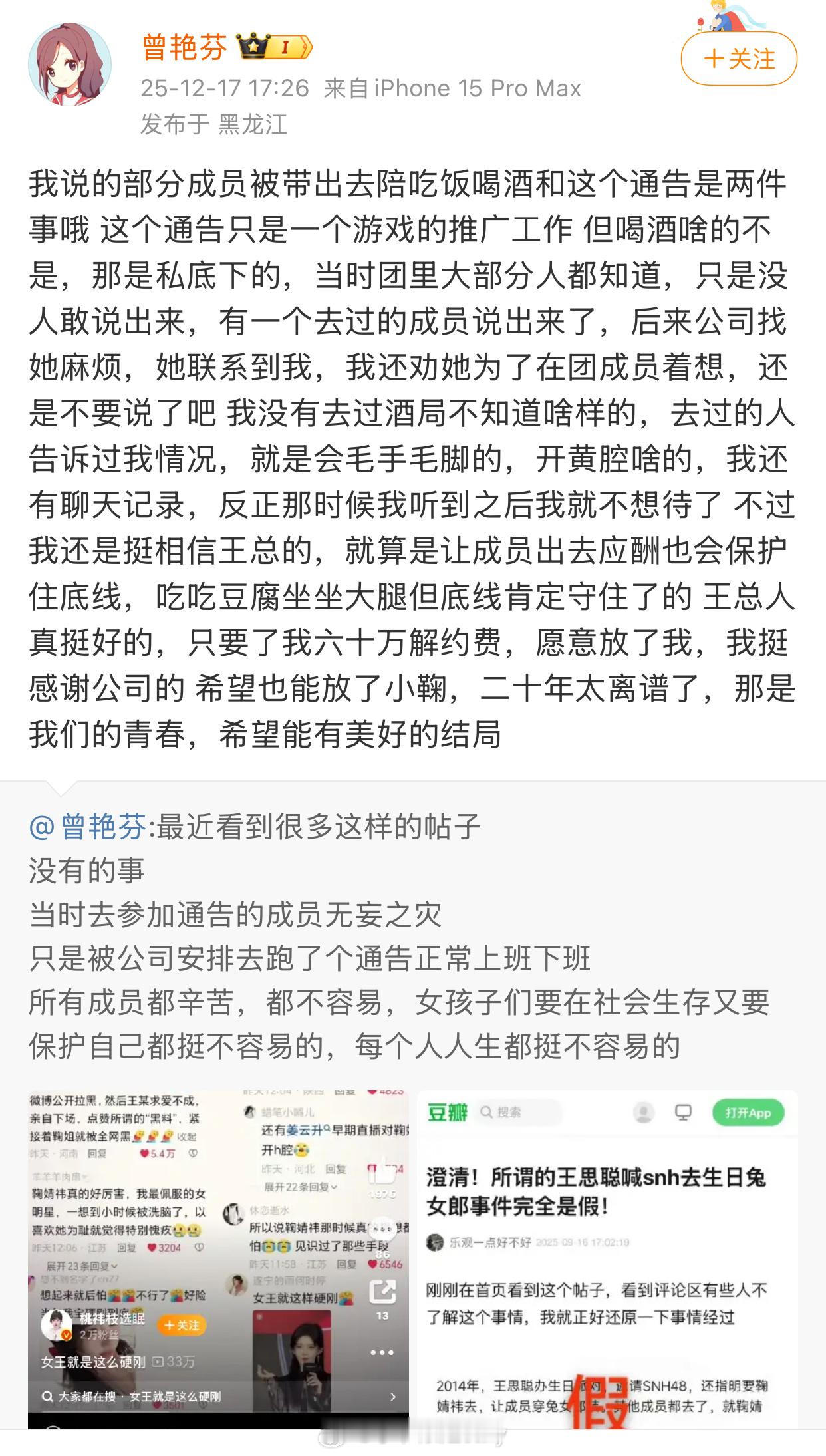 曾艳芬再发文。。:我没有去过酒局,去过的人告诉我情况老天哦 可以stop了吧