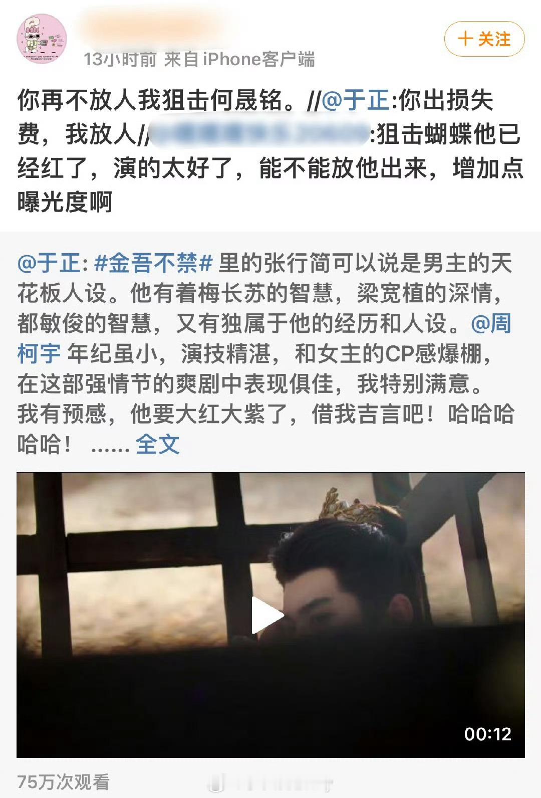 网友说于正再不放周柯宇去星光大赏就狙击何晟铭🤣