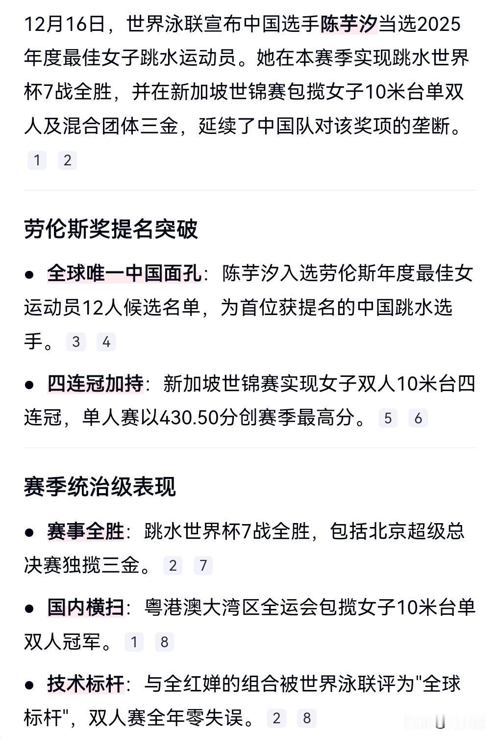 厉害了。陈芋汐迎来了高光时刻。 12月16日消息。 陈芋汐当选年度最佳女子跳水运动员。 全红婵状态不好,今年表现确实没有陈芋汐亮眼。 希望全红婵的状态好起来呀,重现当年的巅峰。